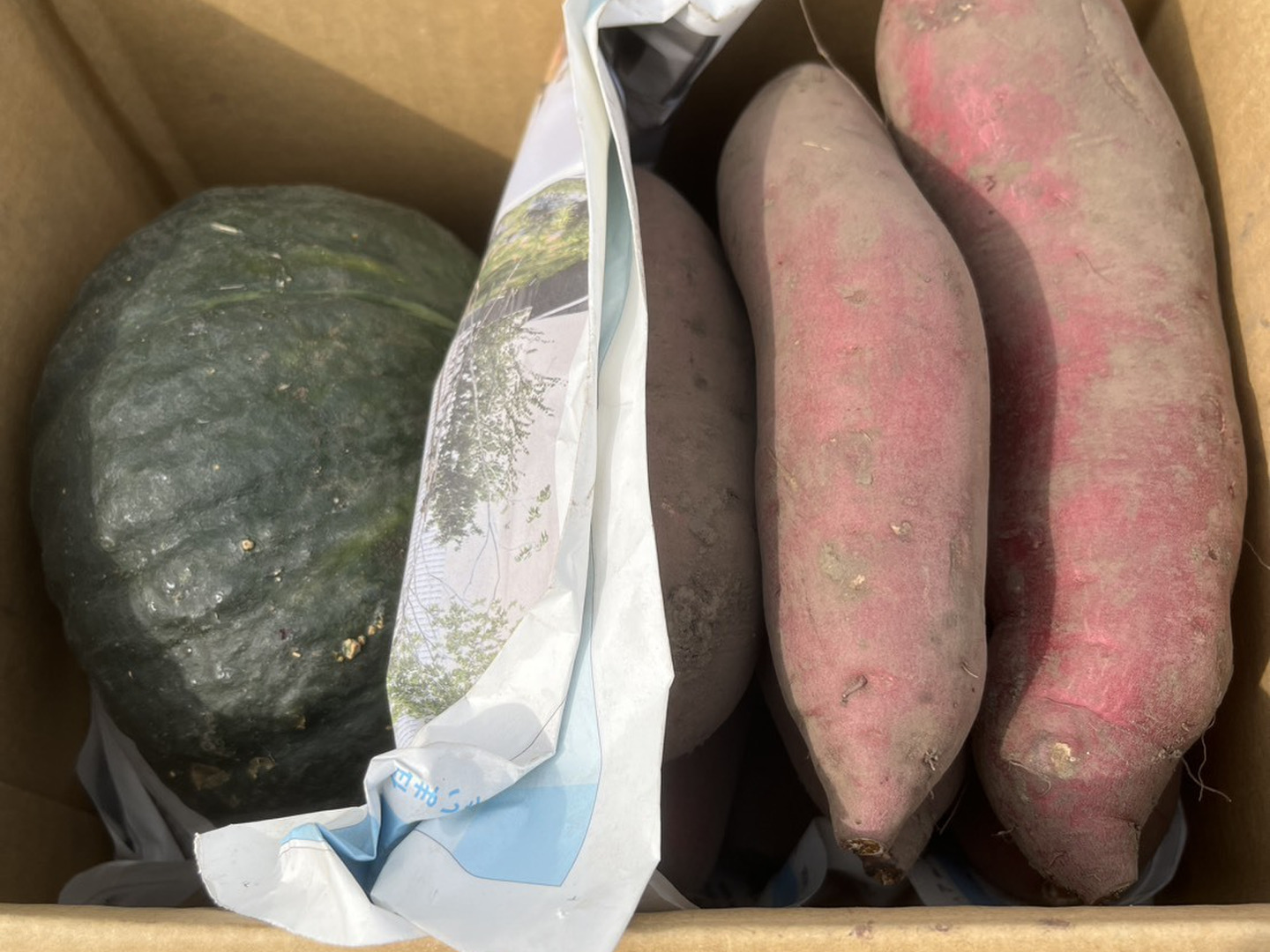 焼き芋に適したMサイズ(150~250g)から大学芋などの加工に向く2Lサイズ(400g程度)を混在でかぼちゃと合計5kgにして梱包します。