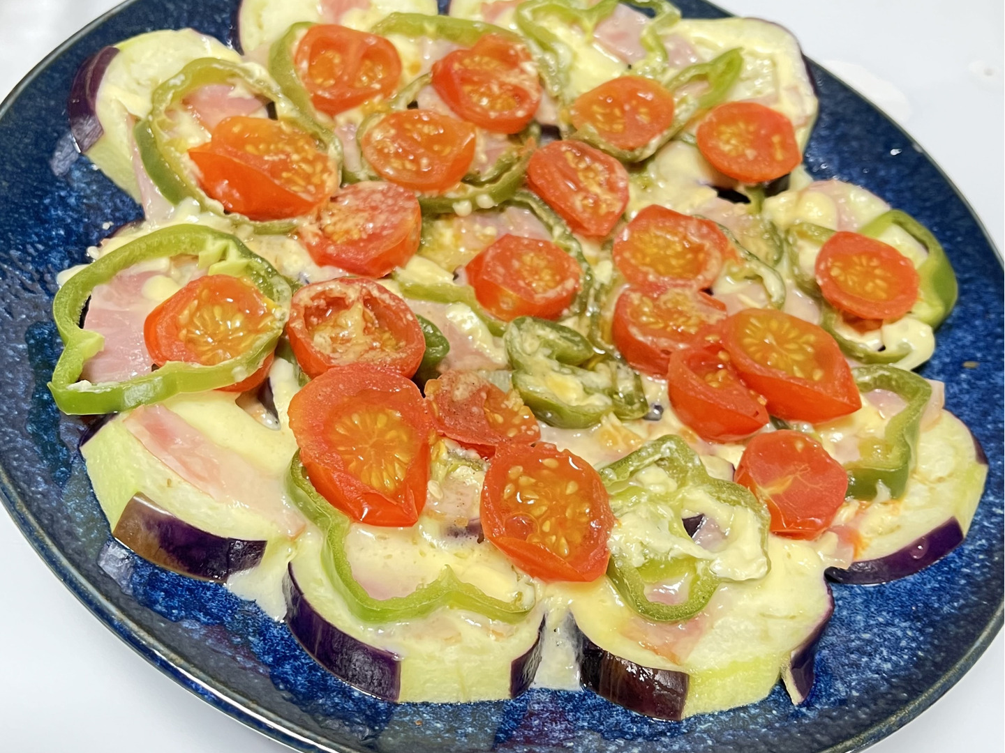 ナスを輪切りにして、トマト・チーズ・ベーコン・マヨネーズ・塩胡椒をON♪