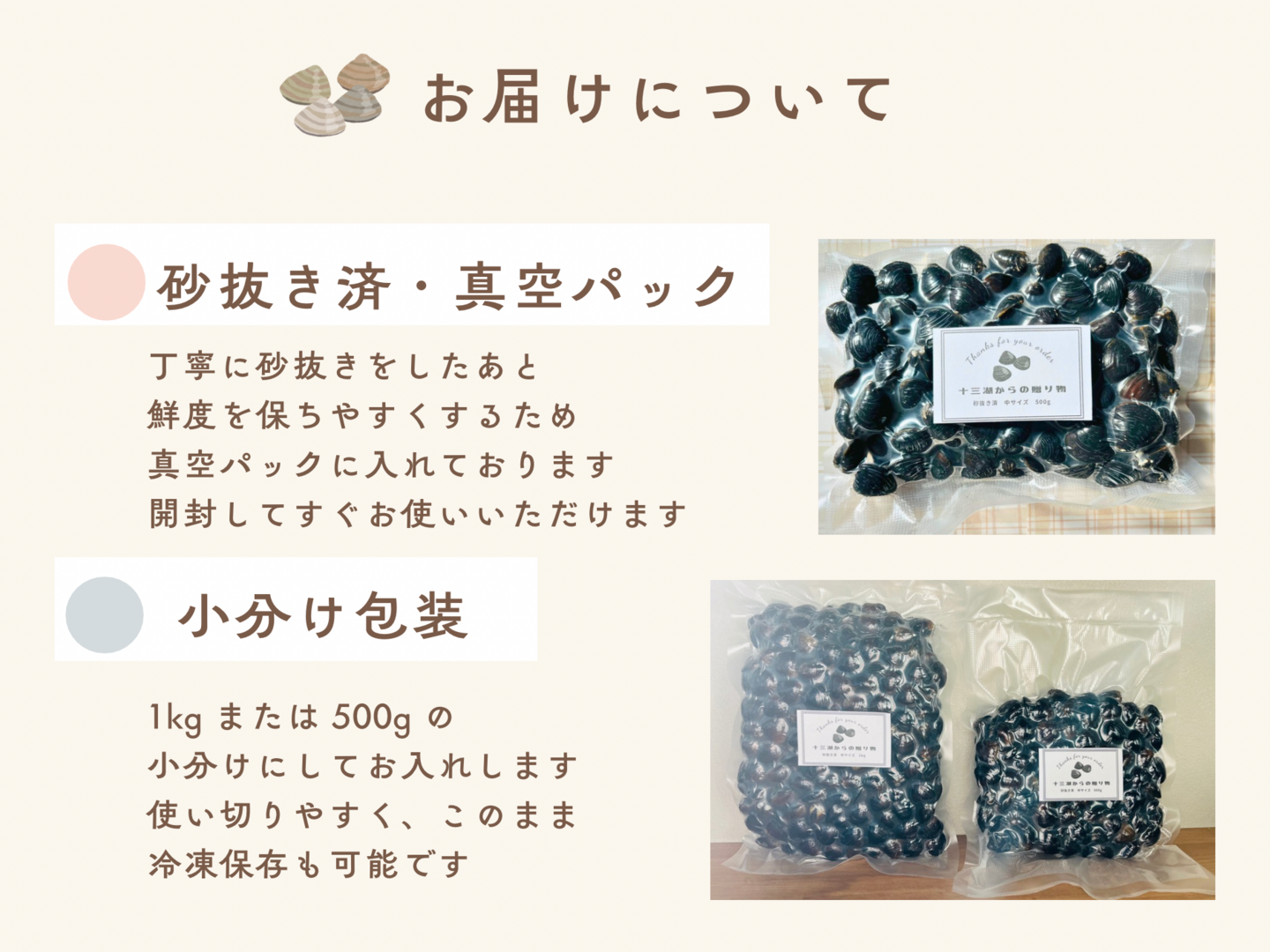 ※日曜日、水曜日は漁が休みなので発送できかねます。朝にとったしじみを砂抜きして発送しますので注文時間、曜日によっては発送が少し遅くなることもございます。ご了承ください。
