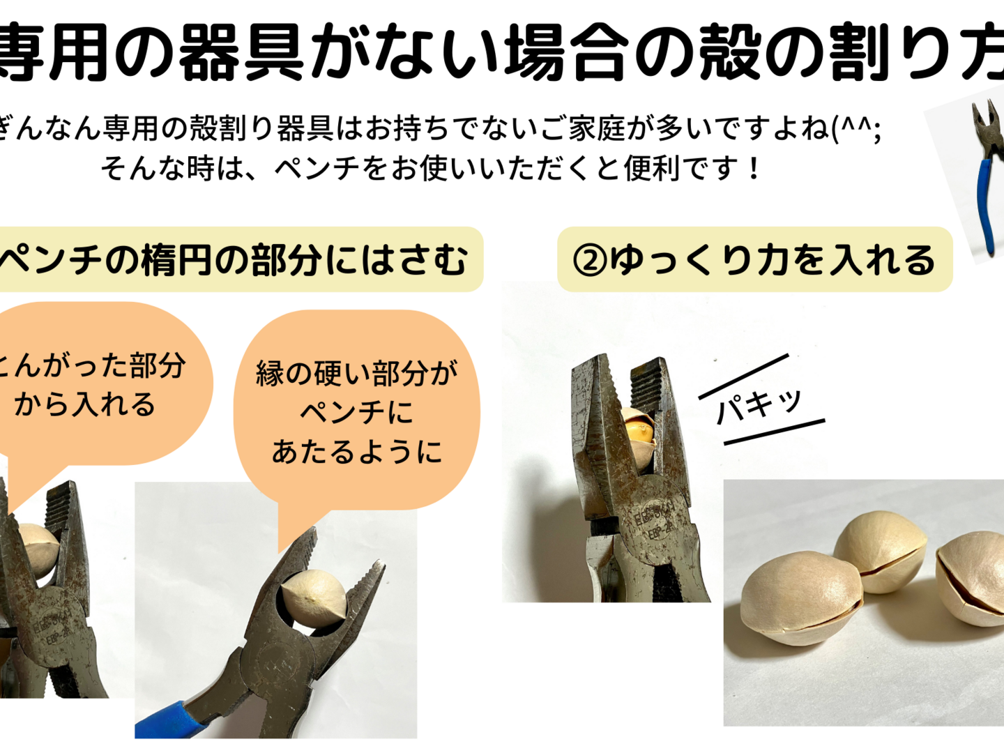 銀杏の頭(とんがった部分)からペンチの楕円の部分に入れます。このときに銀杏の周縁の硬い部分がペンチにあたるようにはさみましょう。