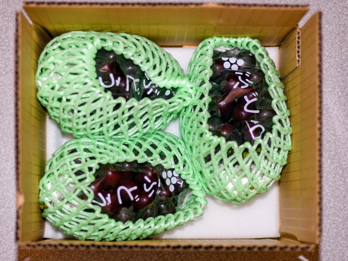 3房で約900gのマスカットノワールを梱包します。化粧箱を使った出荷は行なっておりません。必要最小限の梱包をしております。