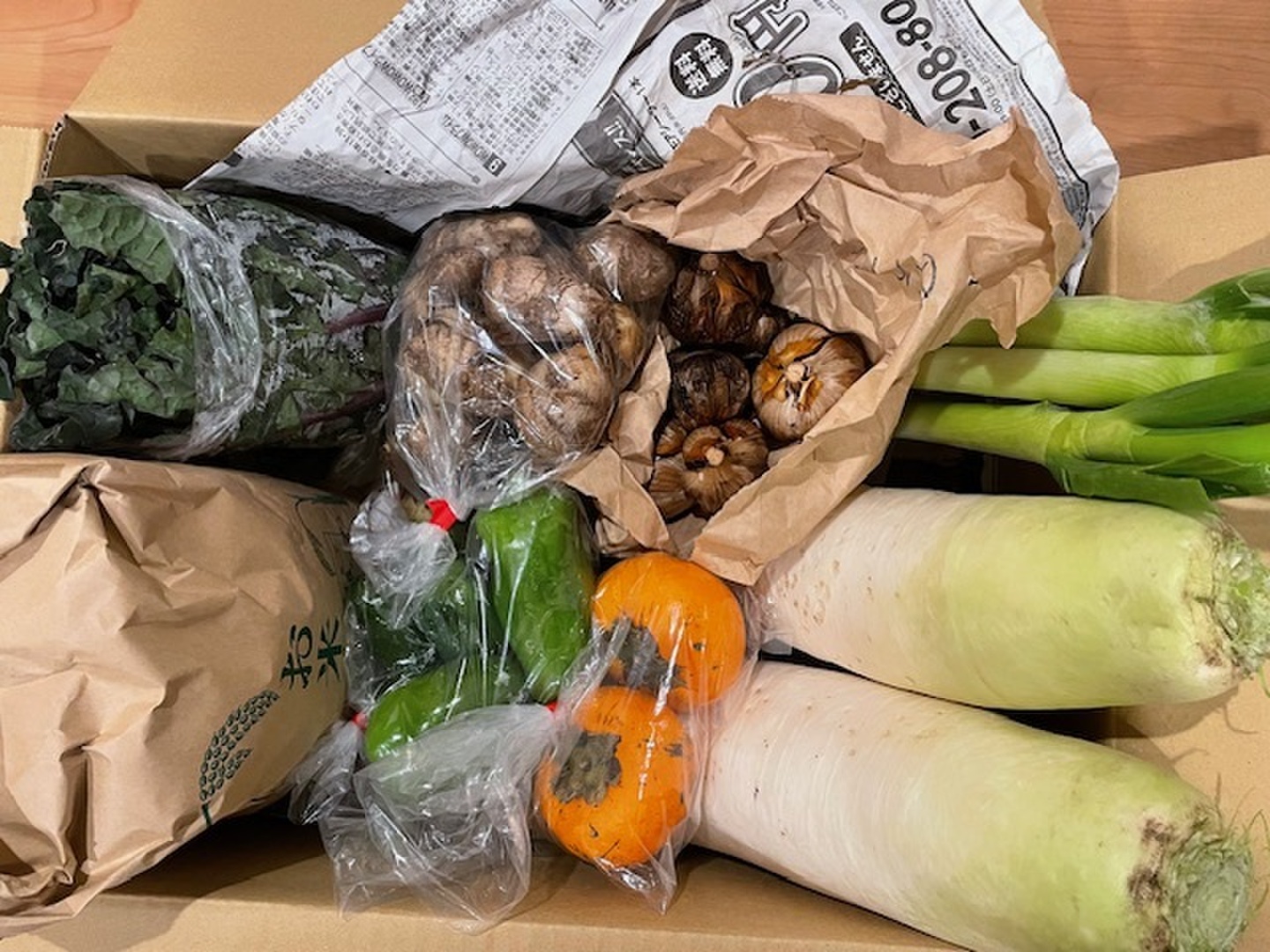 4「季節野菜セット」は旬の自家製秋野菜をおまかせで詰め合わせます。内容は大根、ネギ、白菜ケーレッツ、ミニにんじんです。