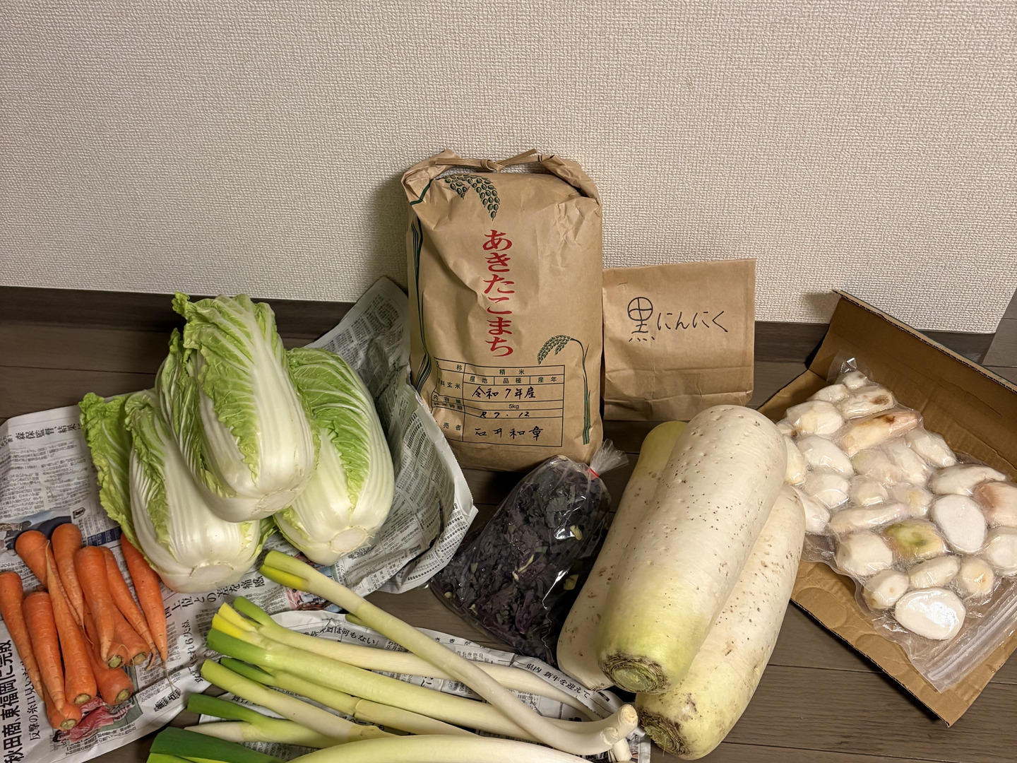 お米5kgと黒にんにく・いものこ&季節野菜数種類程度