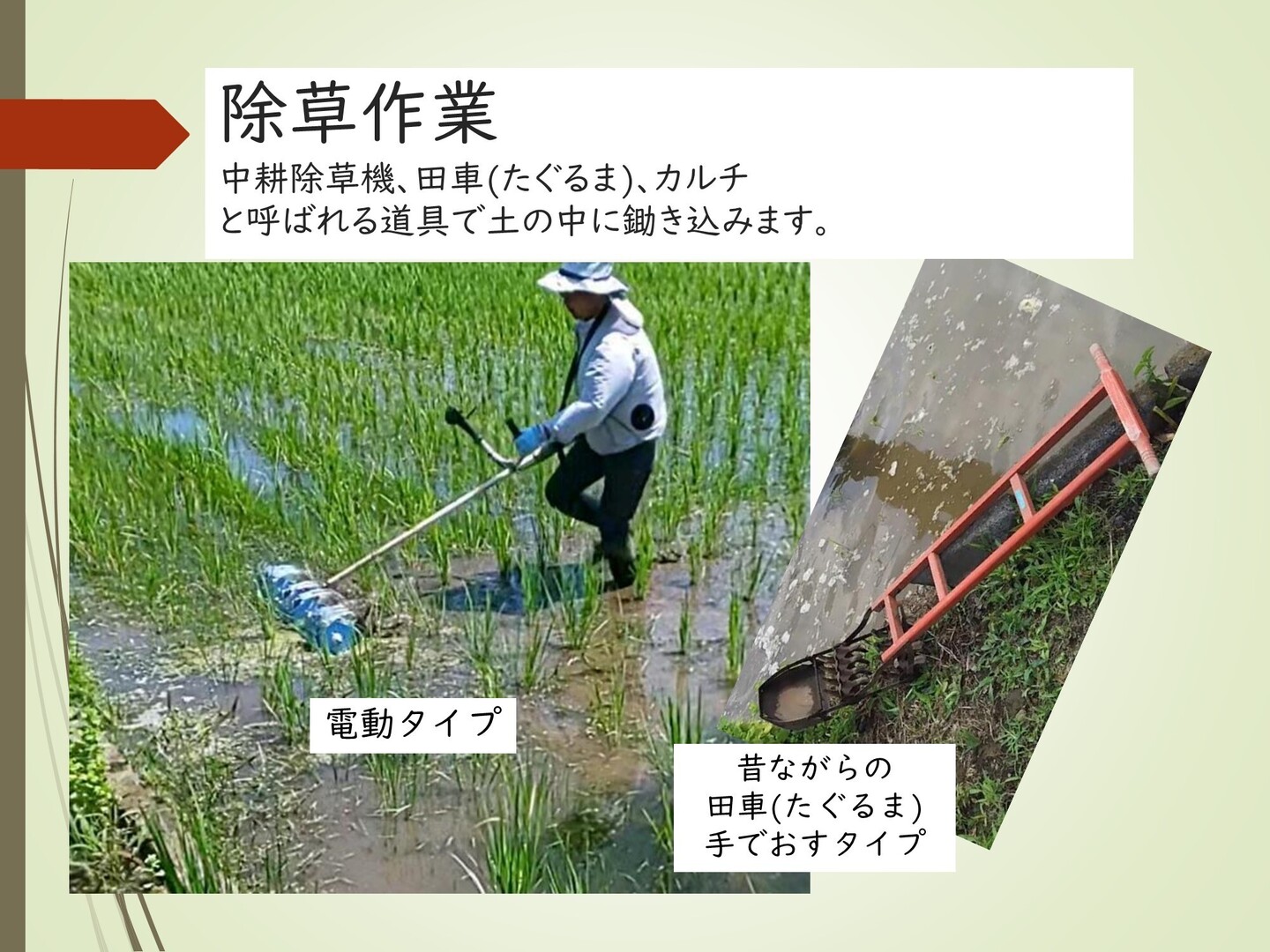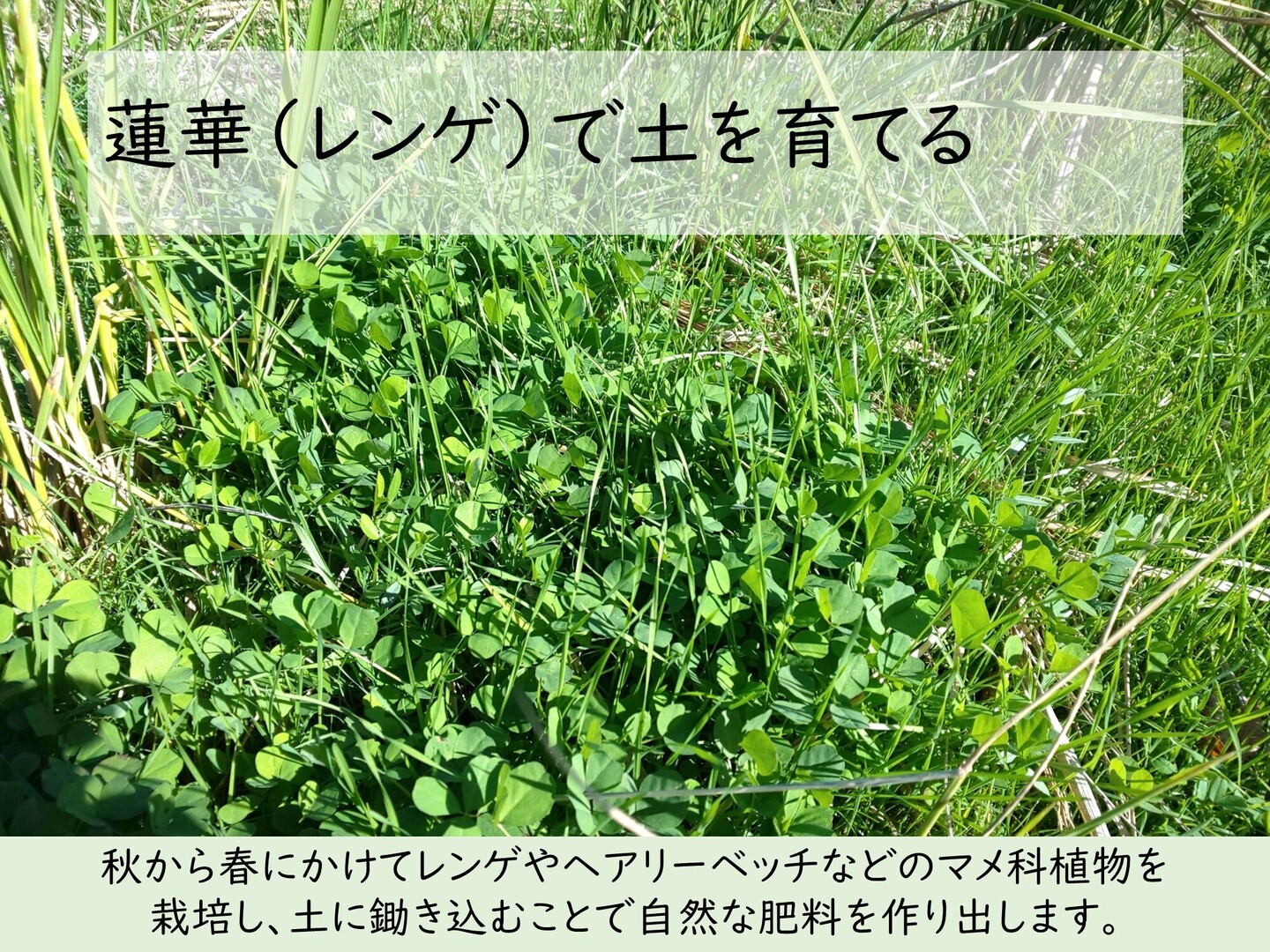 当園では昔ながらの自然栽培と呼ばれる丁寧な手法で栽培しています。秋から春にかけてレンゲ等のマメ科植物を栽培し、土に鋤き込むことで自然な肥料を作り出します。周囲には害虫を忌避する植物(アップルミント等)を植え、自然の力を活かして守っています。また、苗の間隔を広くして風通しを良くするなど、独自の技術で病害虫を予防しながら育てています。除草剤不使用で雑草対策するため、除草機や手作業で取り除いています。