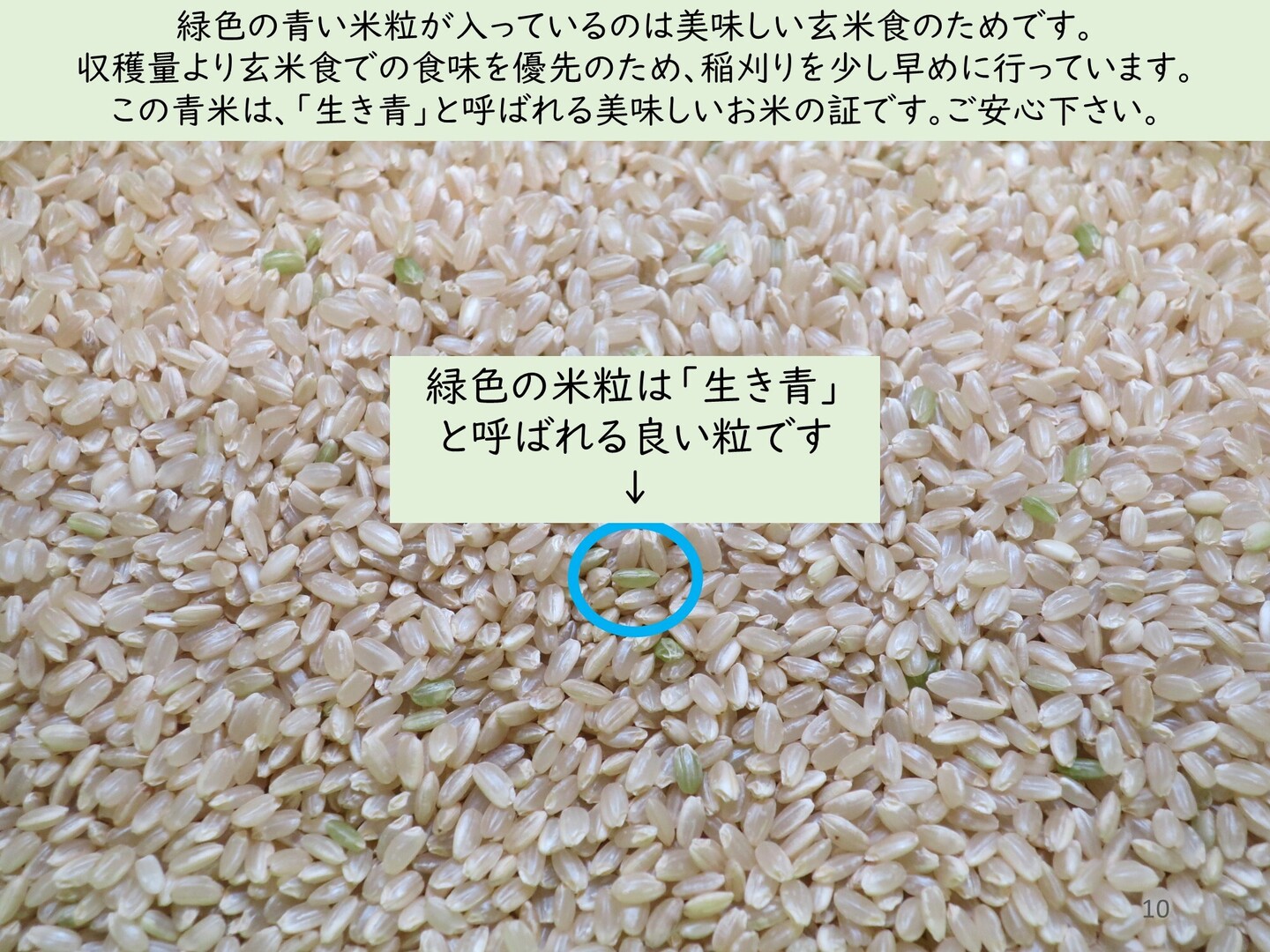 収穫量より玄米食での食味を優先し、稲刈りは少し早めに行っていることから、青米(緑色)が含まれています。この青米は生き青と呼ばれる美味しいお米の証です。