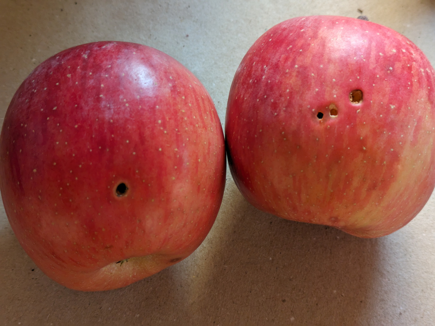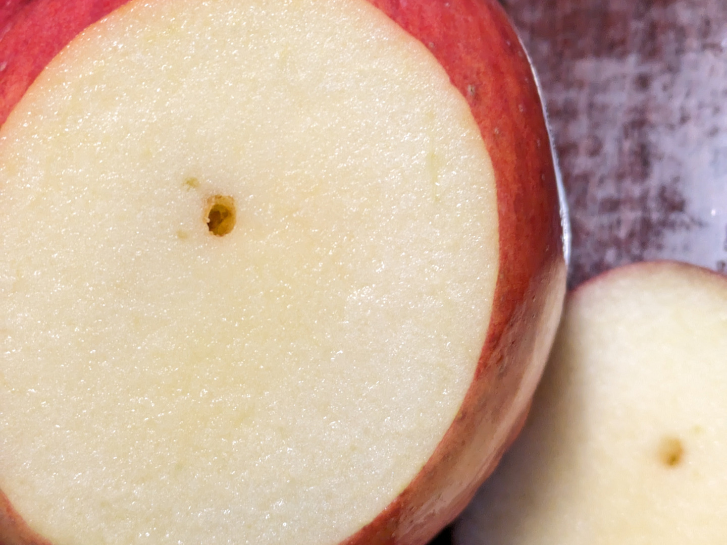 写真(写真はふじです。)にあるように、りんごの内部に虫が食べた跡が残ってしまっています。また、被害状況が外から判断できないため、カットしたほうが良い部分が多くなってしまうりんごがあります。虫等が苦手な方はご遠慮下さい。