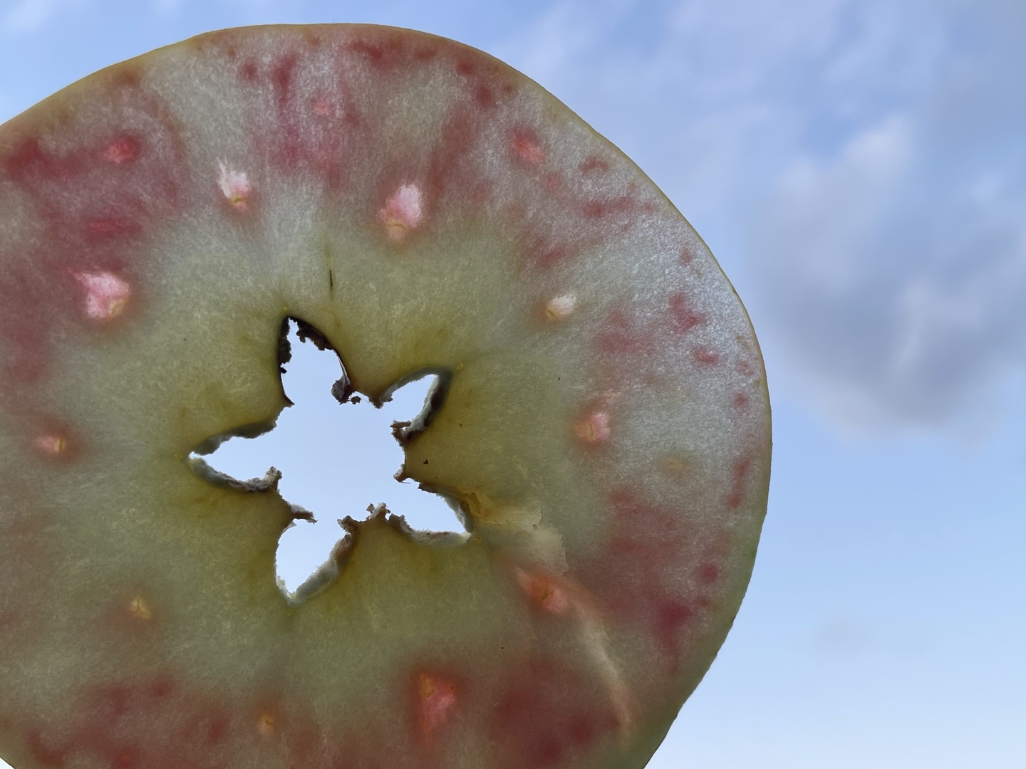 外は黄色いリンゴですが、切ってビックリ中が赤いんです[°□°;]…果汁はピンク!!