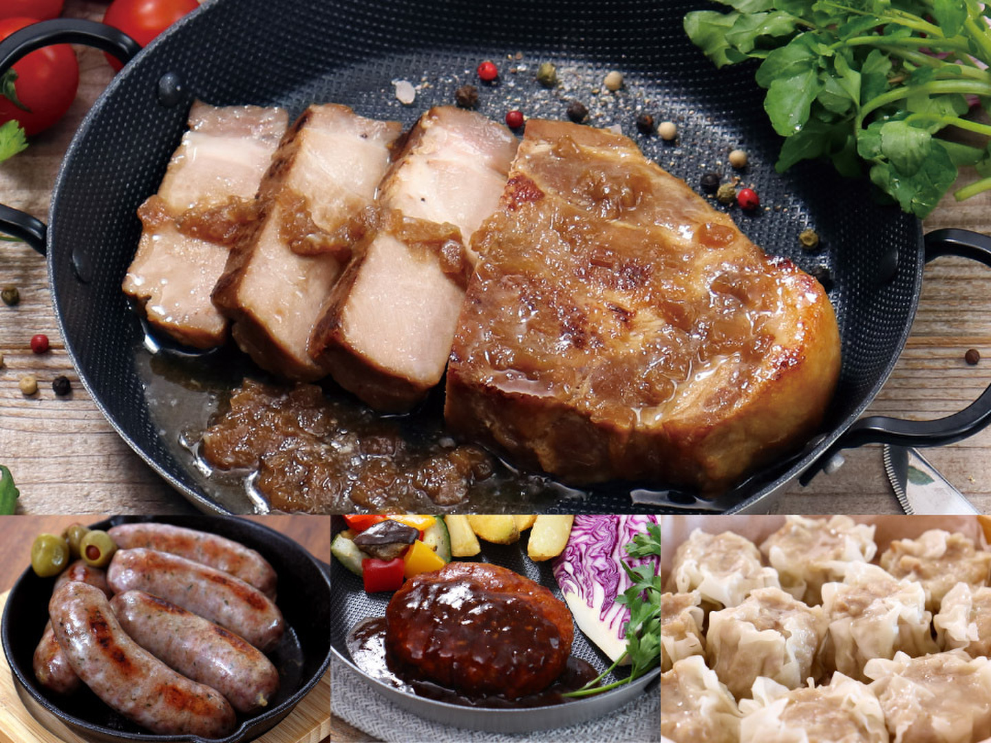 | 内容 | ポークステーキ…約200g(不定貫)×2枚、ハンバーグ…140g×2個、粗挽きハーブフランク…300g(60g×5本入)、大粒肉焼売…300g(50g×6個入) | ||||||