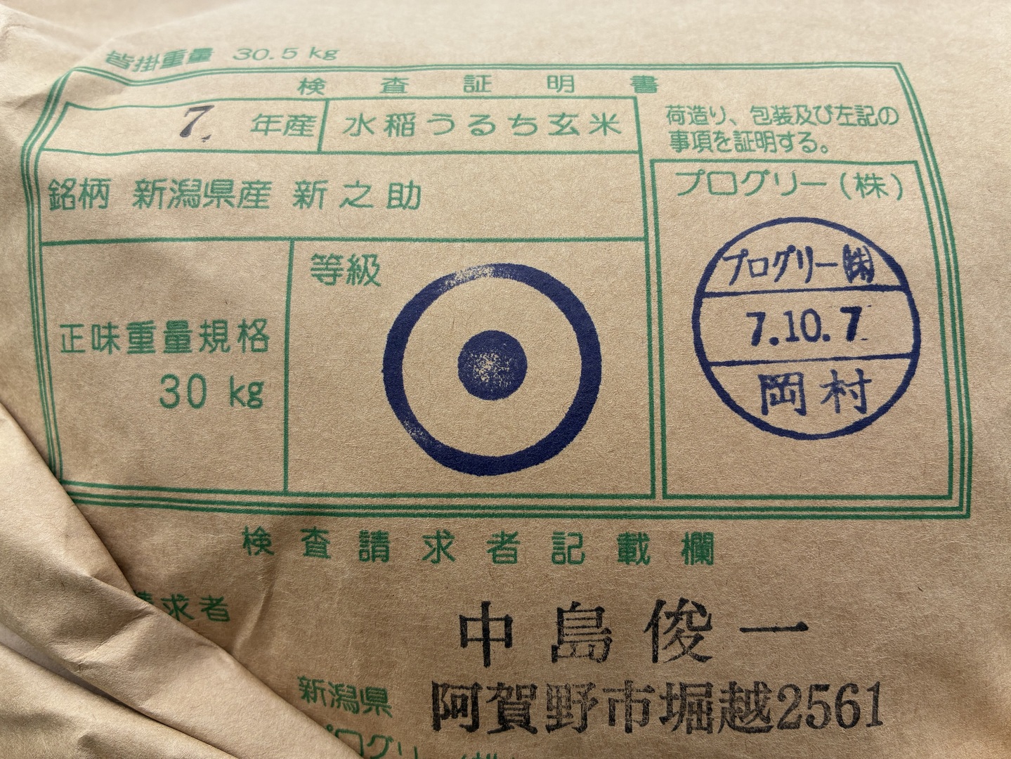 ※玄米クラフト米袋※ 大粒で 粒感がありしっかりとした食感 冷めても固くなりにくい新米 新潟県のお米のトップブランド 新之助(新潟県認証銘柄) 玄米10kg × 3個★農家直送★色彩選別済