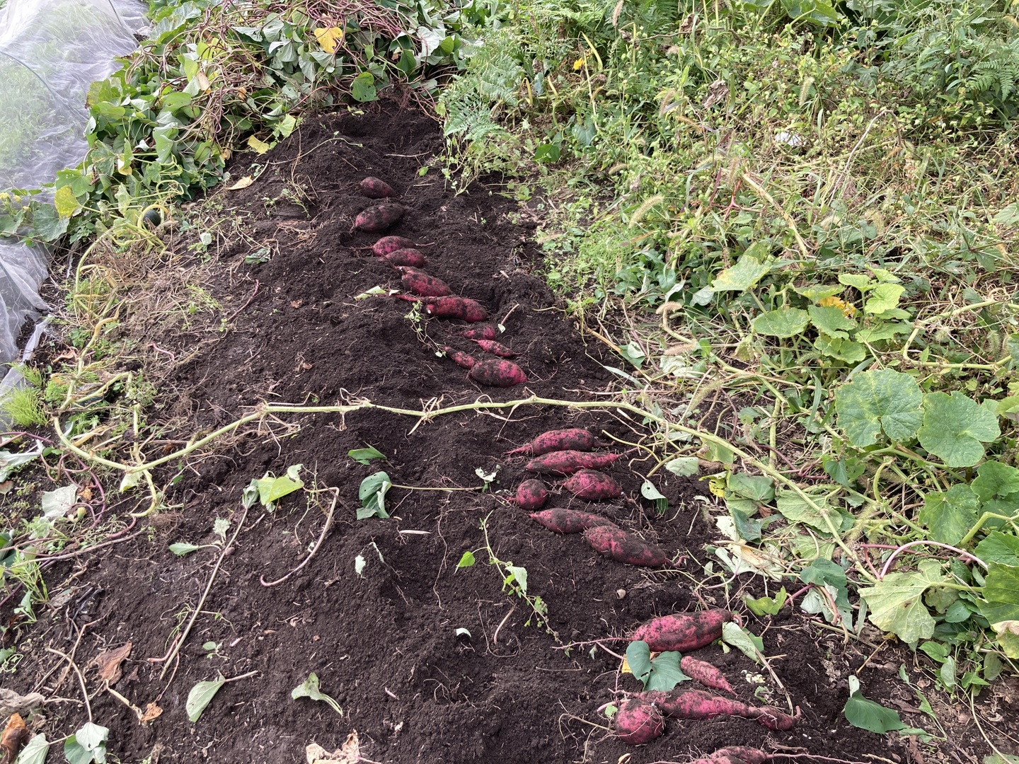 「さつまいも(べにはるか)箱込み2㎏」です。栽培期間中、農薬と化学肥料を使わず育てました。そのため、若干虫食いの穴がありますこと、ご理解いただけましたら幸いです。