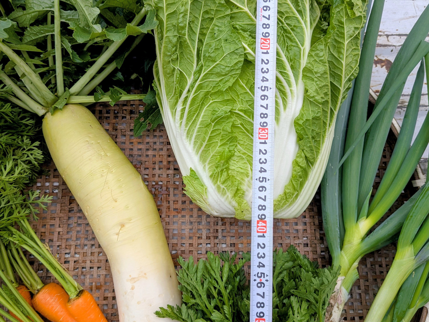 白菜、葉付き大根、葉付き人参、春菊、じゃがいも、ねぎ2種のお野菜セットです。