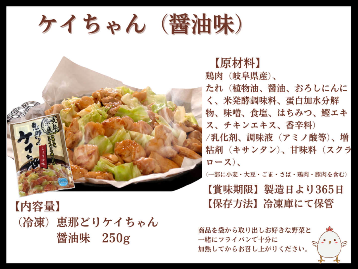 | 内容 | 岐阜県産 恵那どり 3品セット(唐揚げ500g×3袋、フライドチキン4枚×2袋、ささみスティック200g×2袋、ケイちゃん250g×2袋) | ||||||