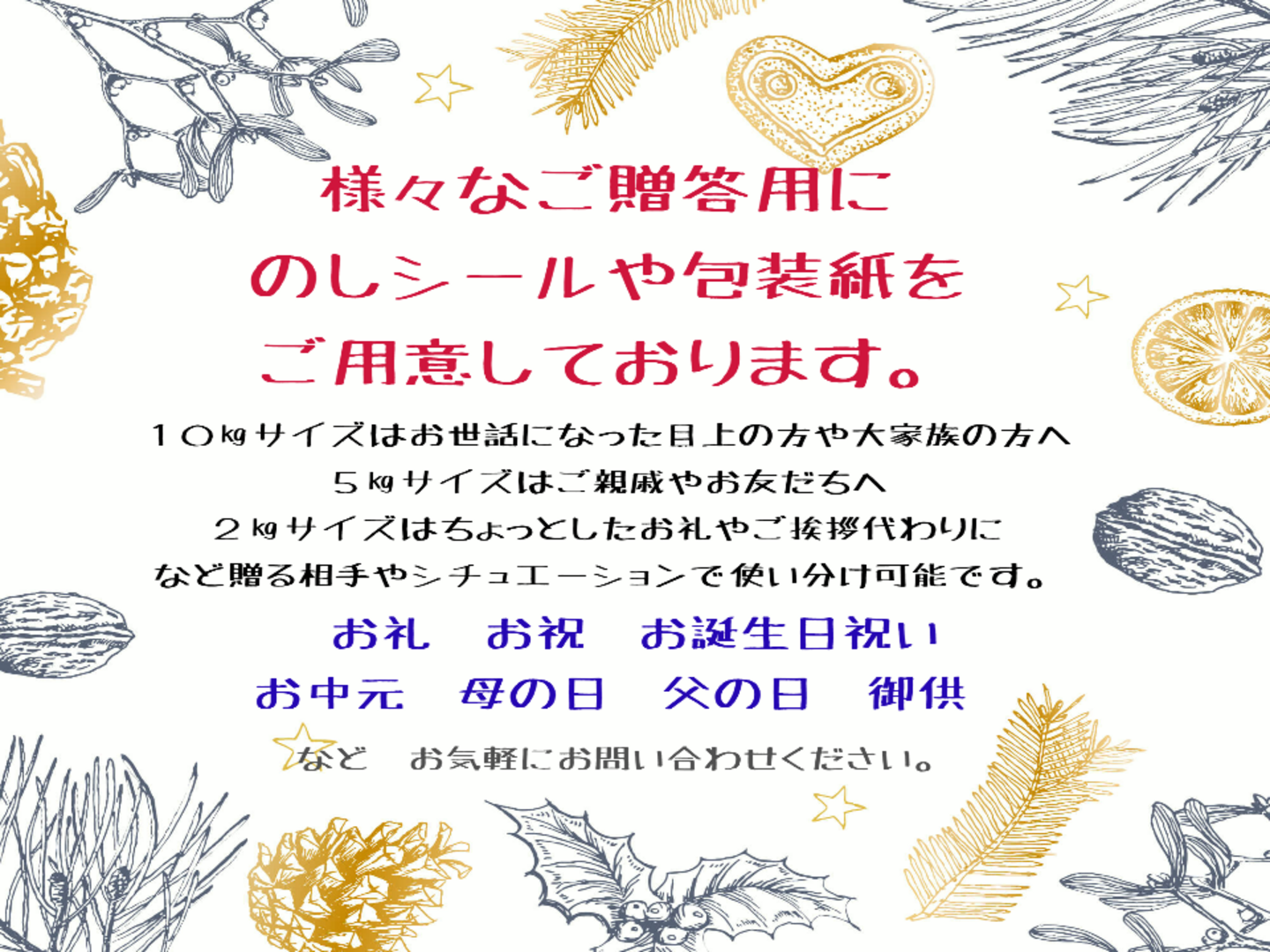 しかしながら、過剰な包装を避け、環境に配慮した対応を心がけておりますため、段ボールの上からの簡易的なギフトラッピングや、カジュアルな「のし(短冊のしシール)」のみの対応とさせていただいております。