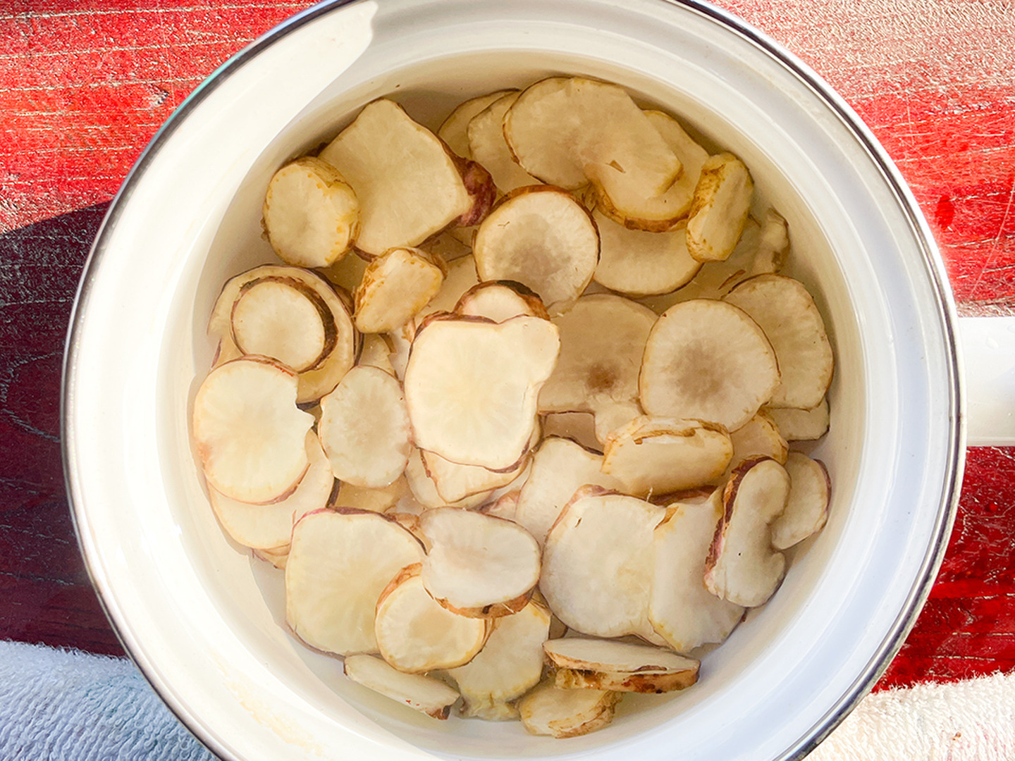 1)紅菊芋を丁寧に水洗いしたあと、水気を切って5mm幅に輪切りします。