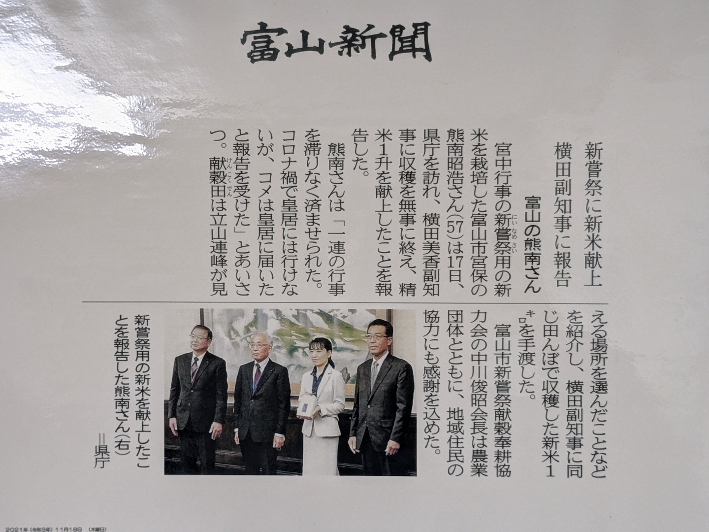 令和3年、優れた米農家として、富山県の代表で皇室へ献上するお役目を賜りました。