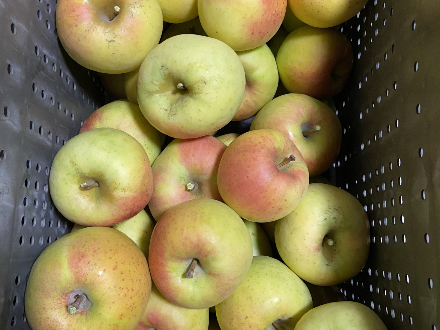 黄色のりんごですが、日光が当たる加減によって、果皮の一部がほんのりと赤く着色しているものもあり、表面の半分が赤く染まっているものもあります。