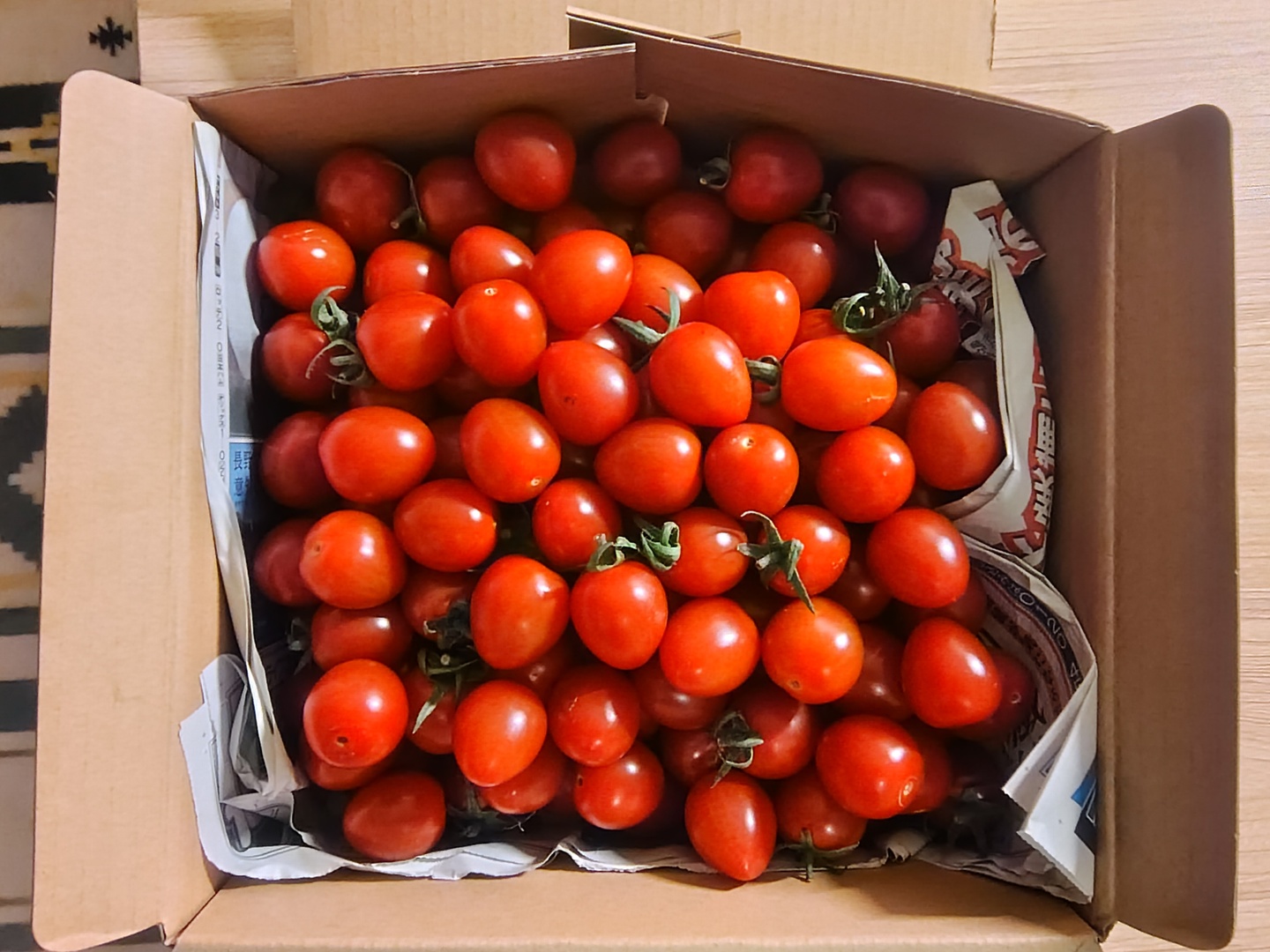 (アイコ)ミニトマトをダンボールに入れてトマトの傷や割れをチェックして箱詰めをします。箱詰めの時は全力尽くして割れ、傷を見て検品をします。