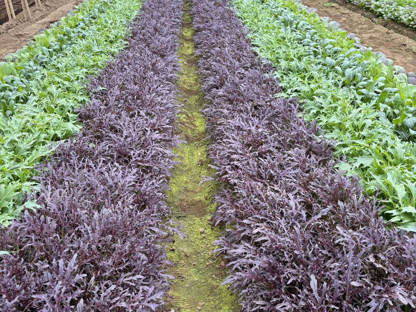 水菜、ミブナのシャキシャキ食感と、ルッコラの風味、からし菜、紫からし水菜のピリっとした辛さのアクセントが楽しめます!