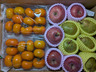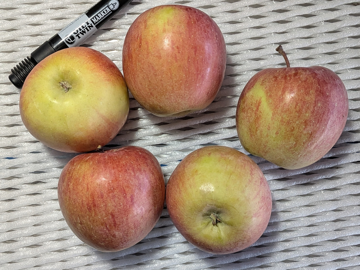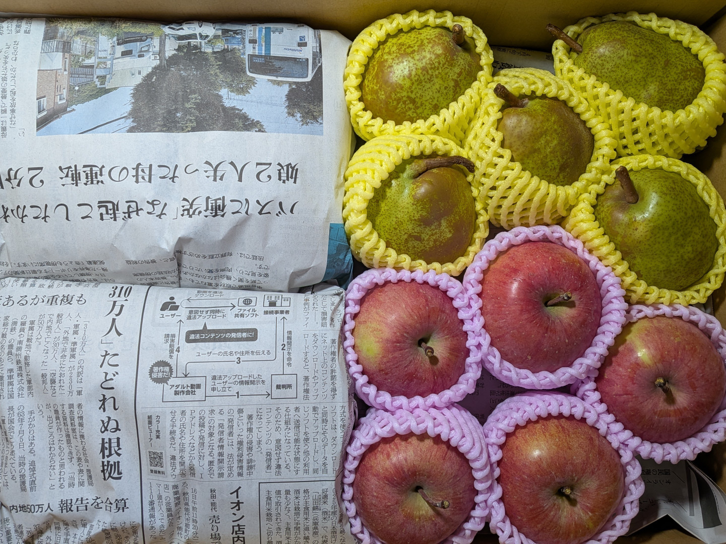 柿は柔らかくなっており、キズや模様があります。リンゴは着色不良、キズ等があります。ラ・フランスはキズ、模様等があります。