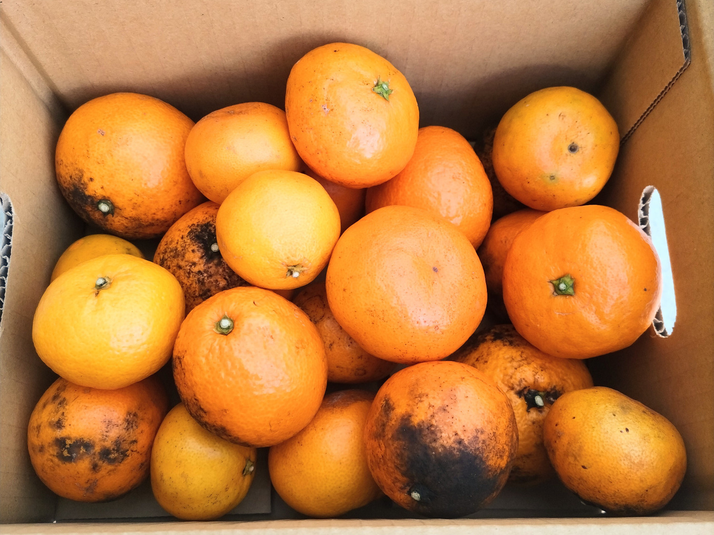 サイズ不選別。その他、外皮の汚れや傷の程度が大きいものが入っています。見た目は残念ですが、中身はきれいなみかんとほぼ変わりません。