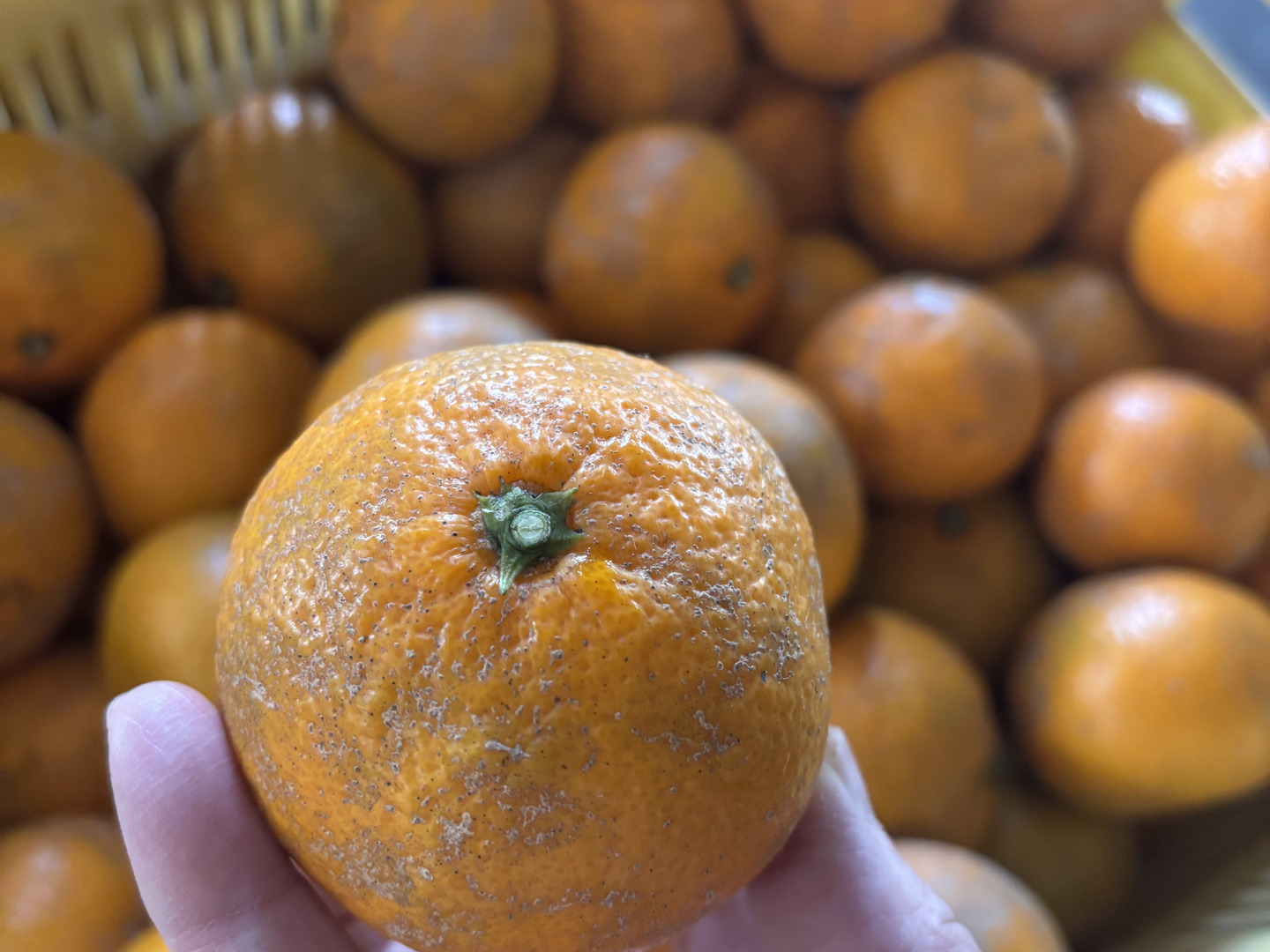防腐剤やワックス、除草剤も使用していません。外皮にガサつきや黒点、スレキズなどあり見た目はきれいではないですが、皮を剥けば味はきれいなものと同じです。