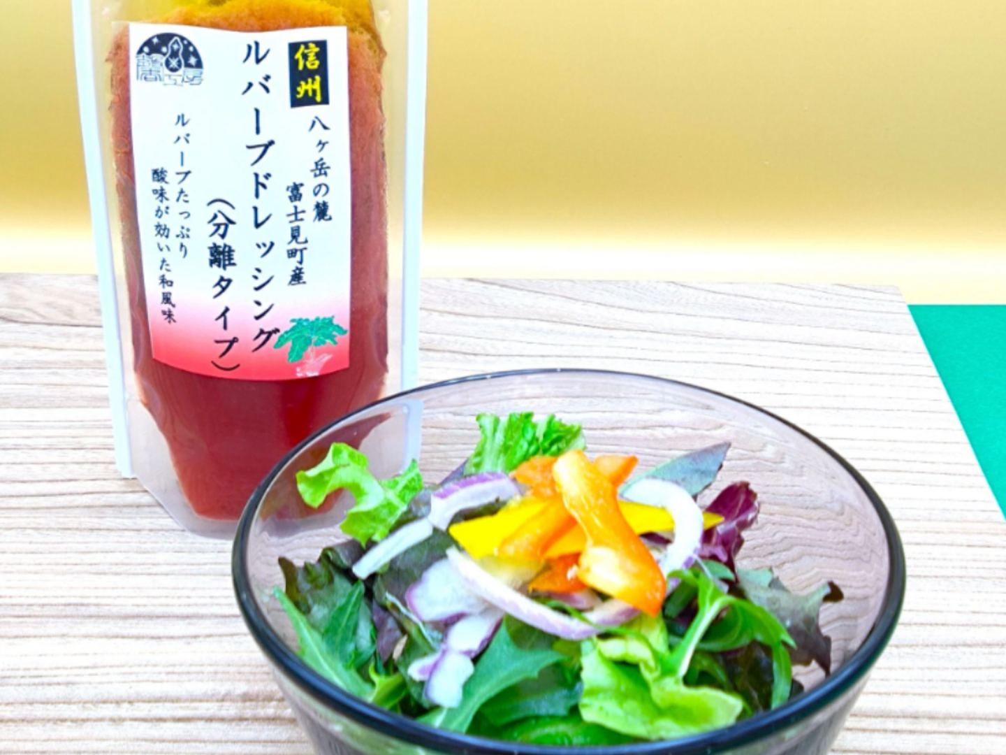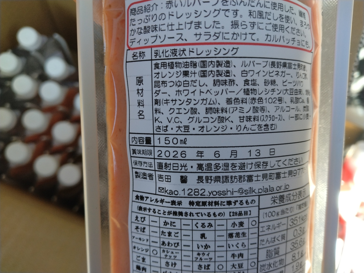 原材料名:食用植物油脂(国内製造)、ルバーブ(長野県富士見町産)、オレンジ果汁(国内製造)、白ワインビネガー、りんご酢、昆布つゆ白だし、調味酢、砂糖、食塩、ビーツパウダー、ホワイトペッパー/着色料(赤色102号)、乳酸Ca、香料、クエン酸、調味料(アミノ酸等)、アルコール、炭酸K、V.C、グルコン酸K、甘味料(スクラロース)、(一部に小麦・さば・大豆・オレンジ・りんごを含む)