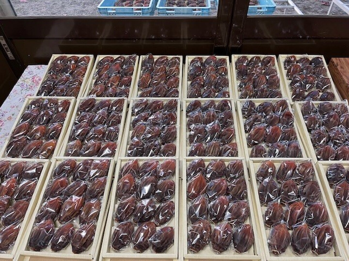 同じ干し柿でも水分が50%前後で柔らかいものは「あんぽ柿」ですが、水分が25%から30%位で甘味成分が結晶化し白い粉が吹いてくるものが「枯露柿」です。