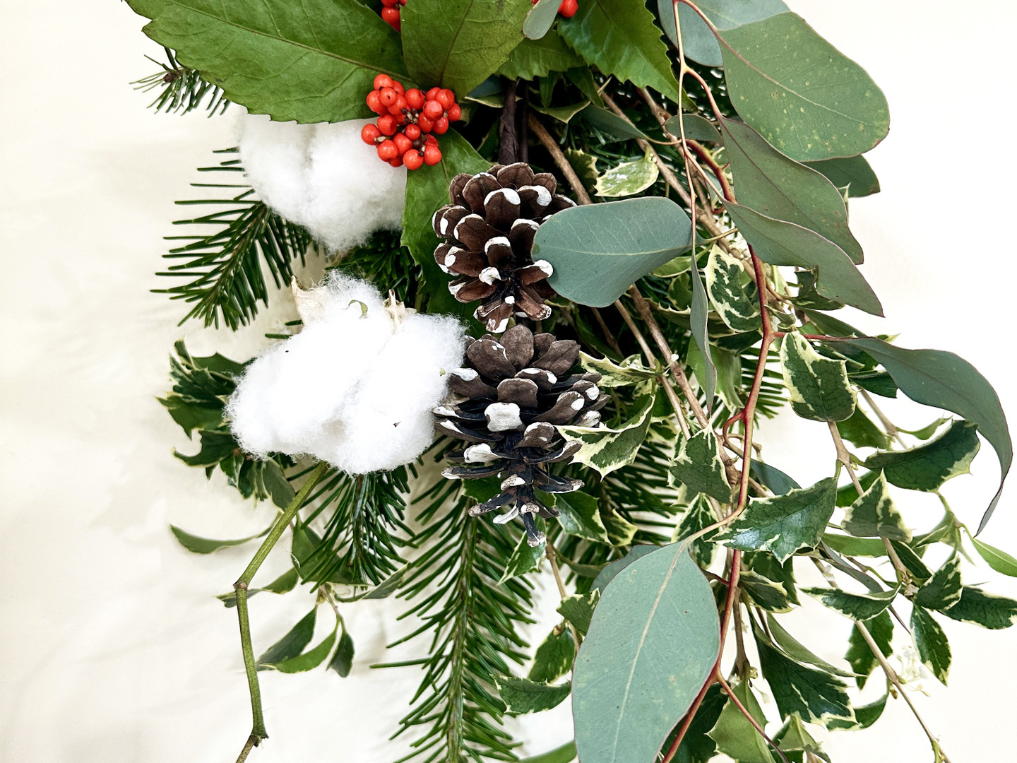 赤い実・ユーカリ・綿花・松ぼっくりを組み合わせ、冬のやさしい雰囲気をそのまま切り取ったような一品です。