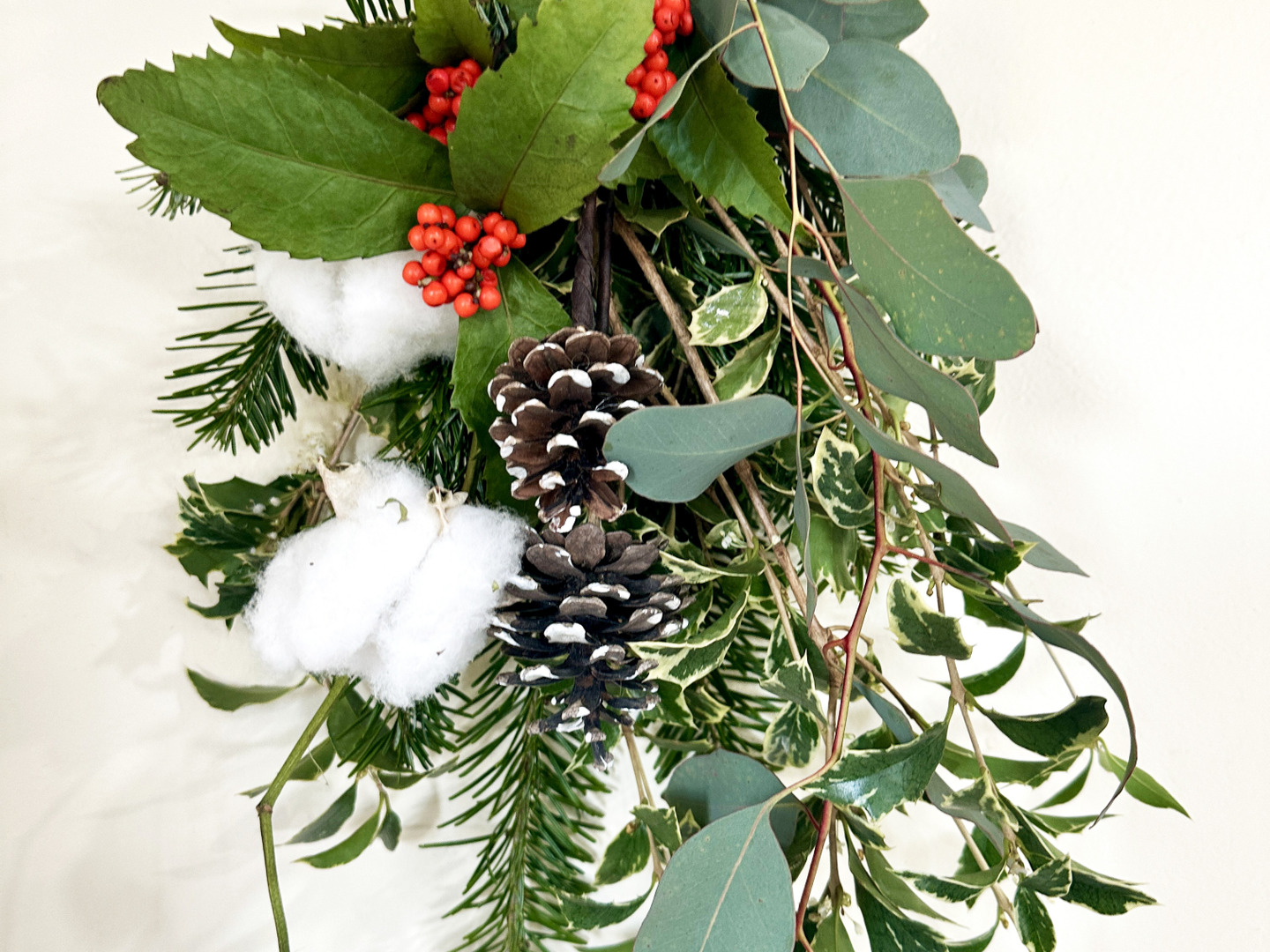 今年のクリスマスは、ナチュラル素材の上質スワッグで華やかに。自然素材だけで束ねた、あたたかみのあるクリスマススワッグ。