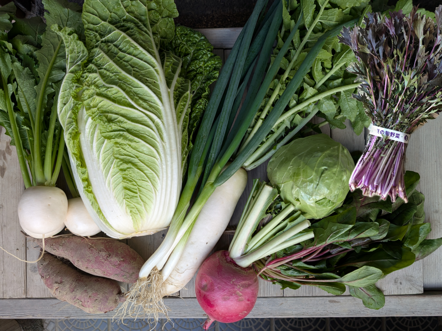 京都産 オレンジクイン白菜1個、ミニキャベツ1個、大根1本、鷹峯ネギ200g、さつまいも500g、赤ほうれん草200g、紅水菜200g、こかぶ3個、赤かぶ1個