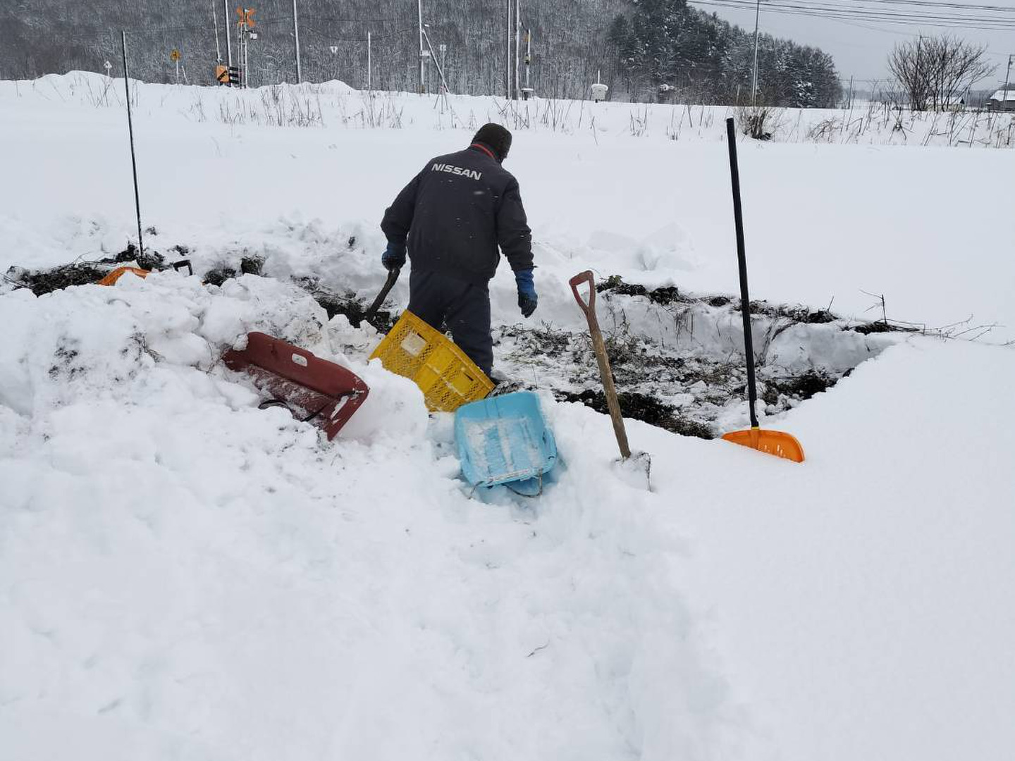 まずニンジンを植えているところまでたどり着くのが大変!除雪機等で雪をはねてからになります。