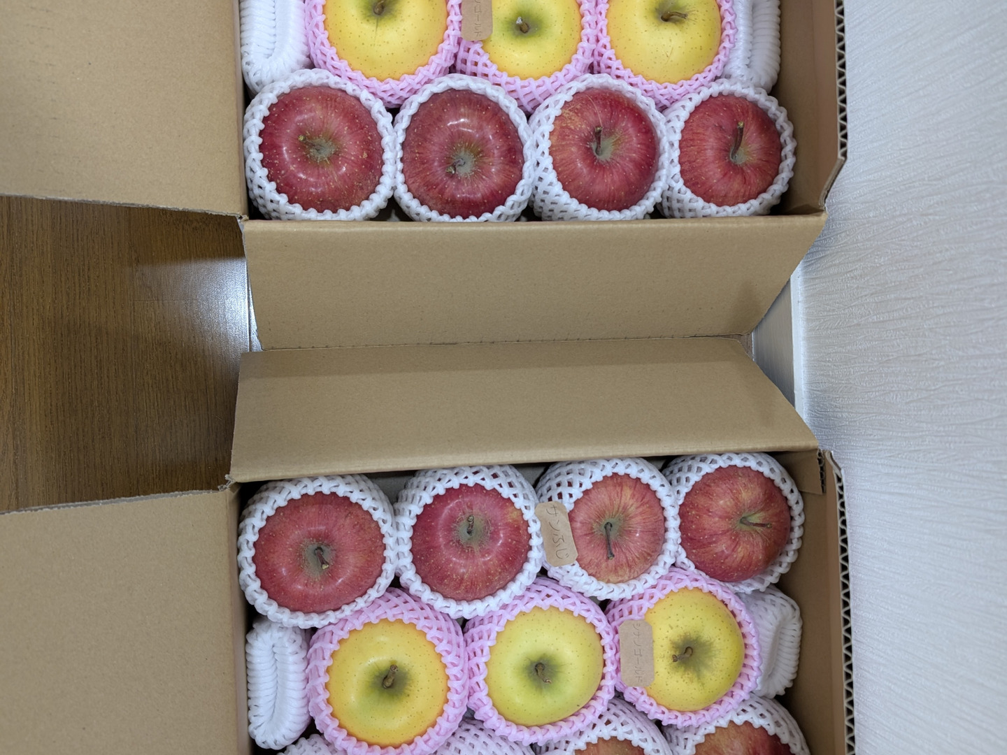 有機JASとの混合がある場合、JASシールをりんごに貼付して詰め合わせをします。
