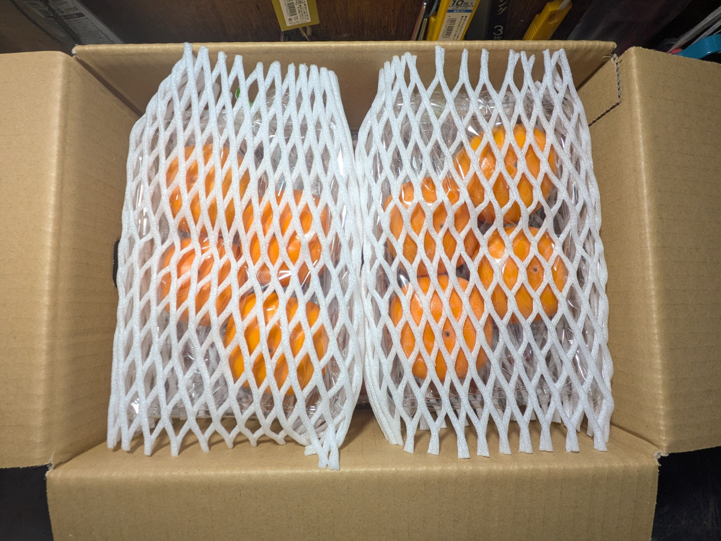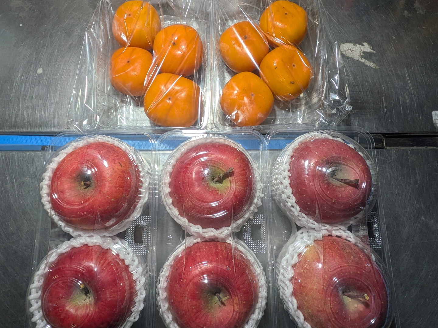 柿の品種は平核無しで低温で熟したものなので、柔らかくなったものとそうでないものがあります。リンゴはふじで1個あたり400g程度の大玉サイズです。