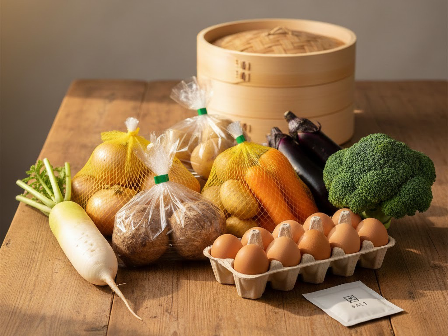 野菜を水に浸さず、蒸気(スチーム)の熱で加熱する調理法、またはその調理された野菜のことです。一言でいうと 「野菜の甘み・香り・栄養を、いちばん素直に引き出す調理法」💡
