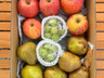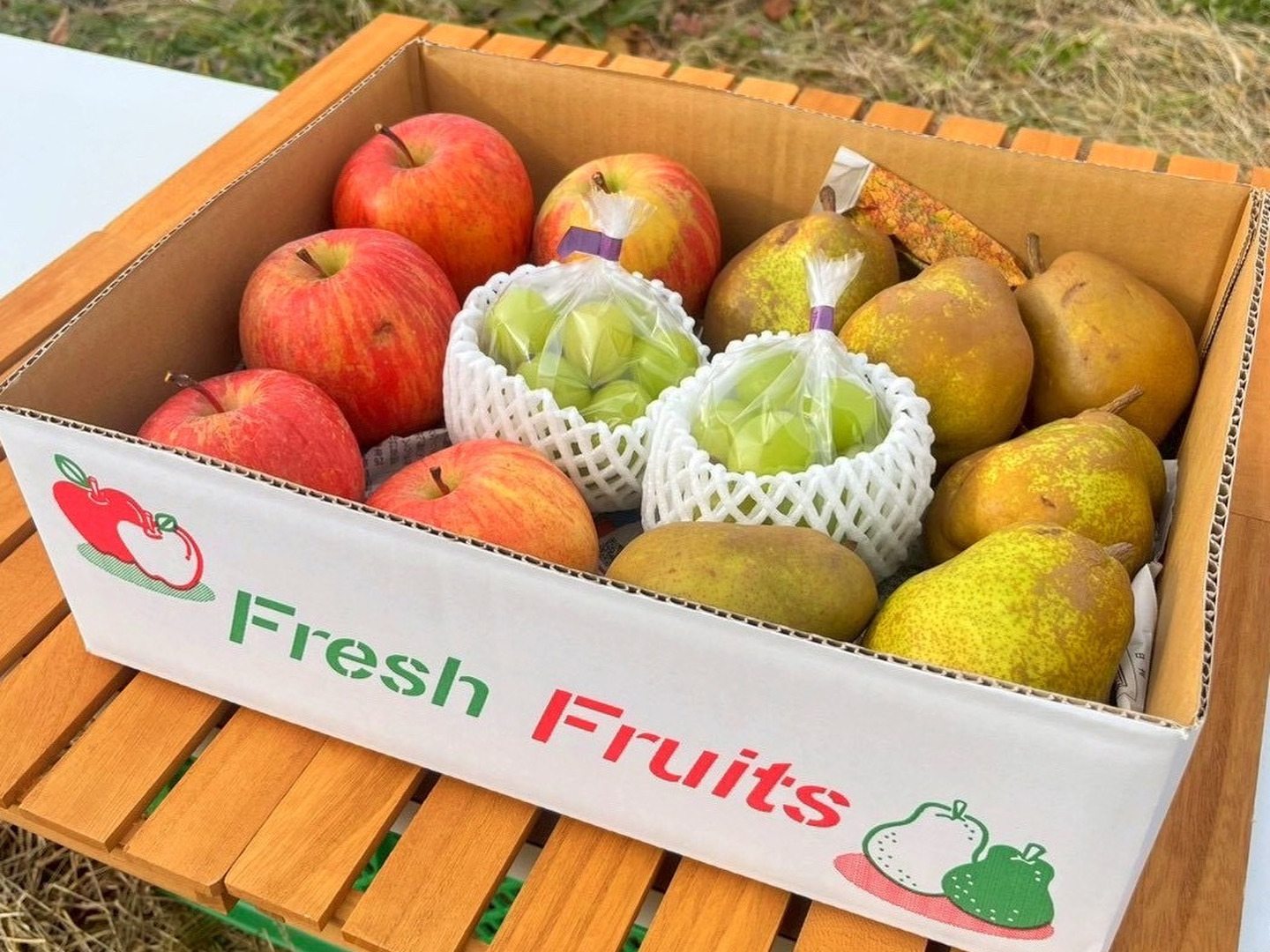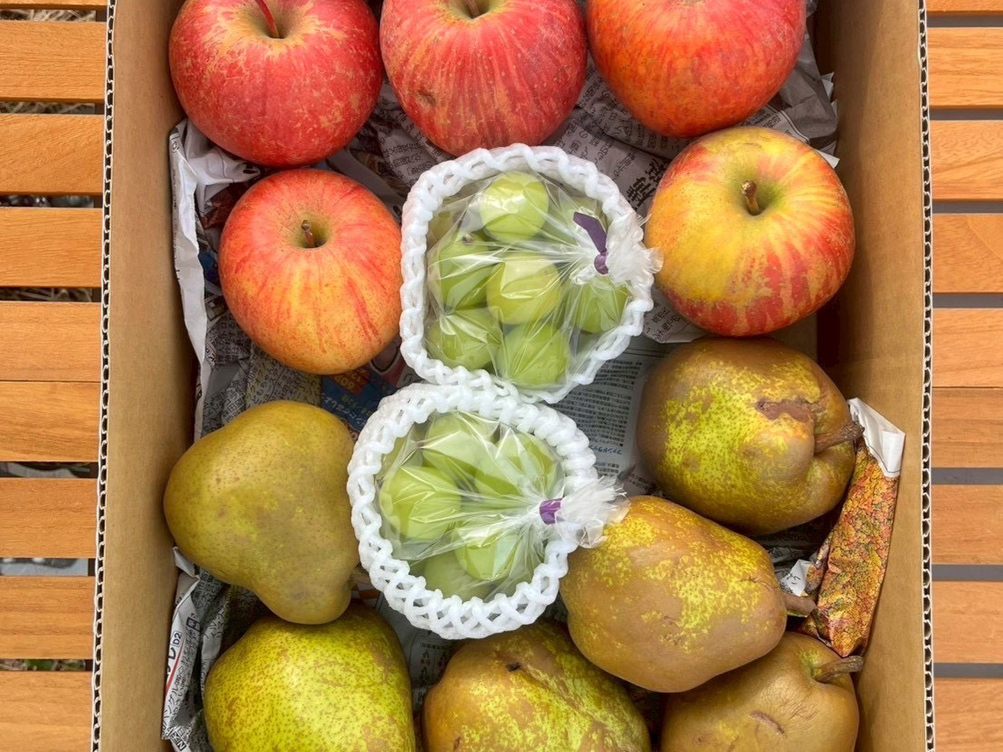 お届けする家庭用ふじりんご、ラ・フランス、つぶつぶシャインマスカットは