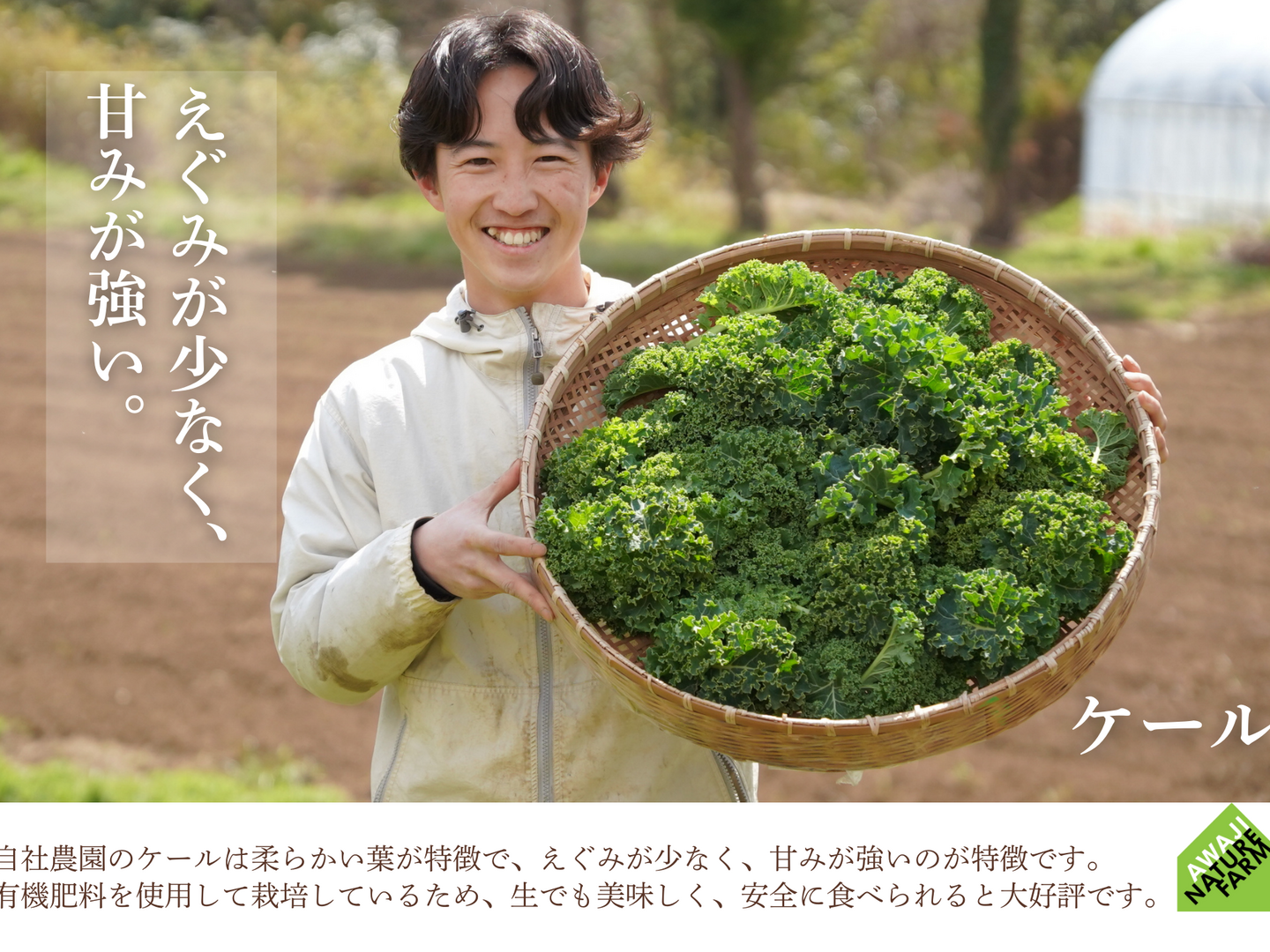 ・・・ビタミンやミネラルが豊富で、栄養価の高い野菜。私たちが栽培するケールは、柔らかい葉が特徴で、えぐみが少なく、生でもおいしくお召し上がりいただけます。