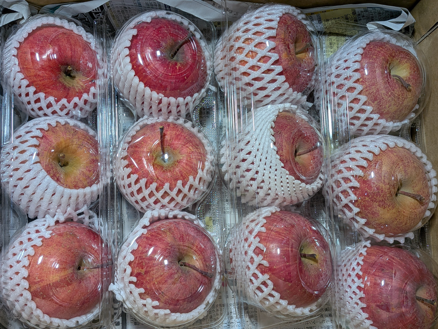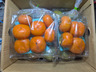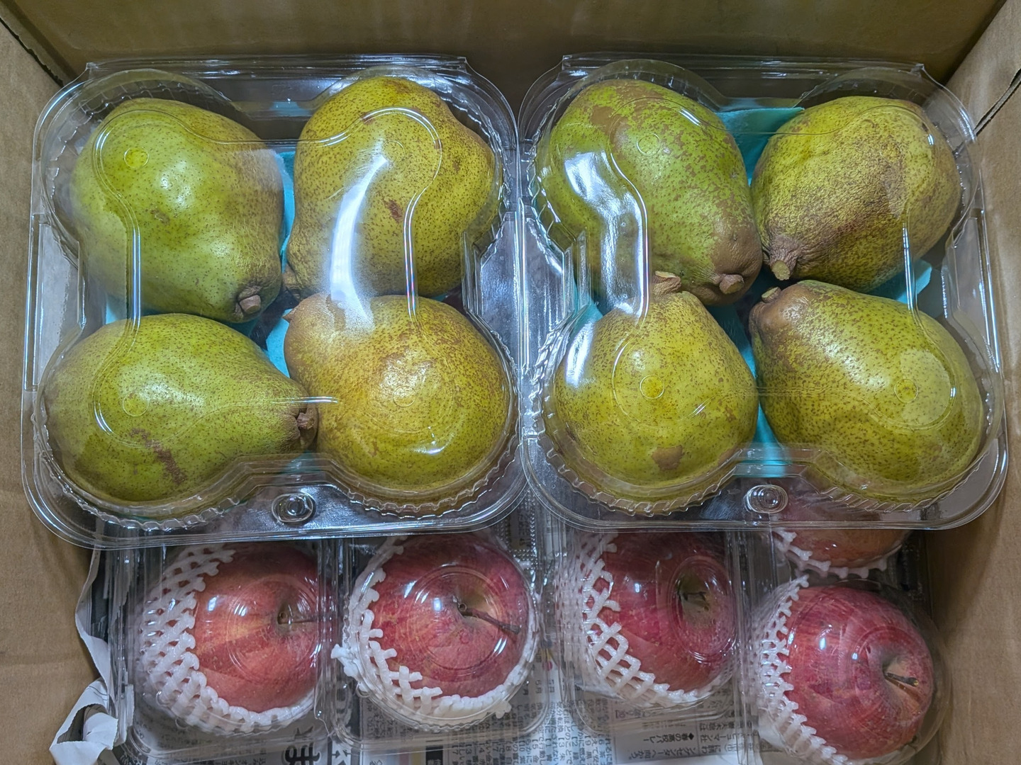柿は完熟して柔らかくなっております。洋ナシは、シルバーベル4個入り✕2パックとラ・フランス3個入り✕1パックです。いずれもキズ等があるB級品です。リンゴは、小さいサイズの着色不良等のB級品です。