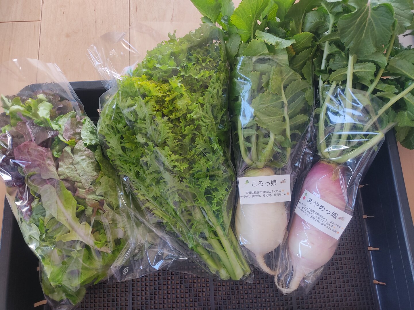 ミニ大根2本とミックスレタス200gとわさびリーフ200gをクール便でお届けします。