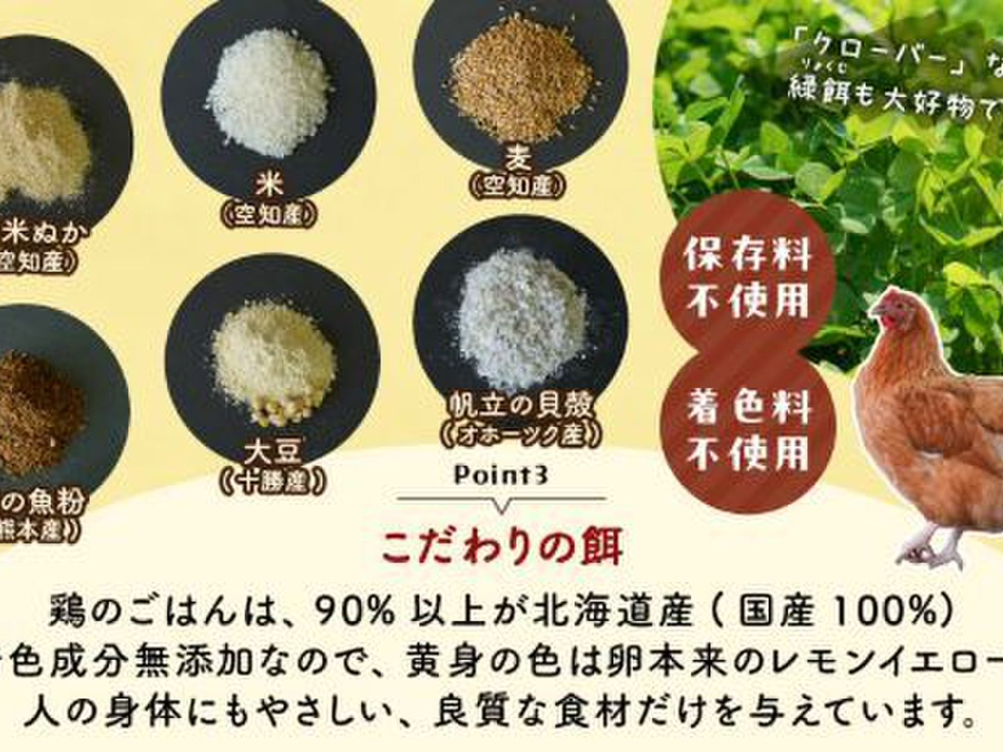 米、麦、精米糠は空知産、大豆は十勝産、魚粉は九州産(卵に臭みをなくすため無添加のかつお魚粉)を使っています。