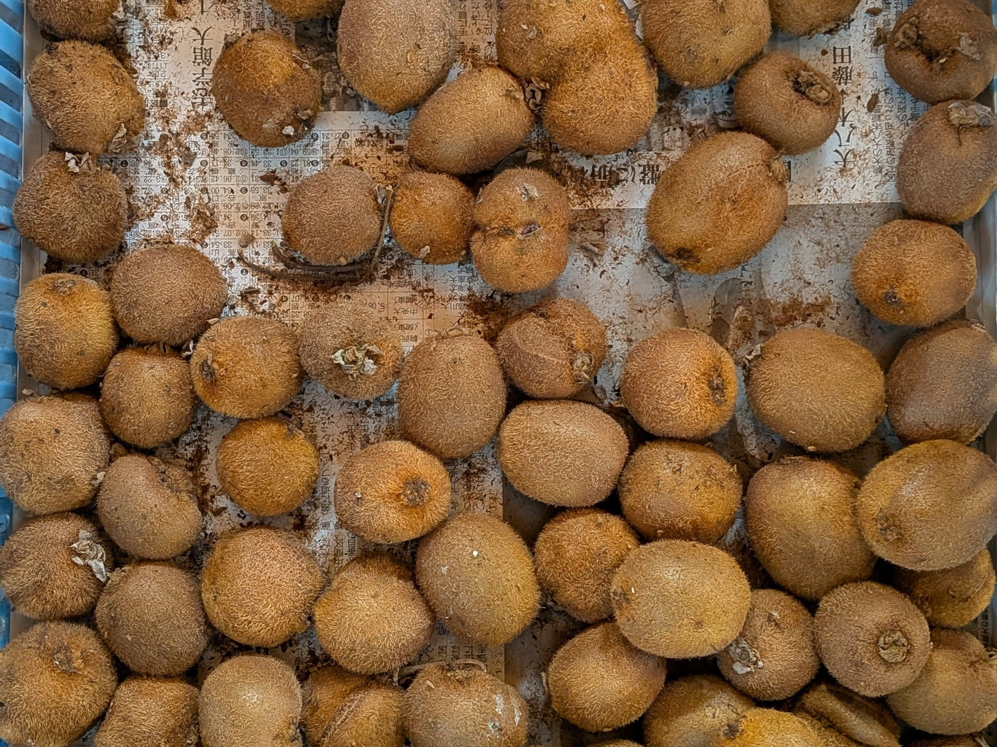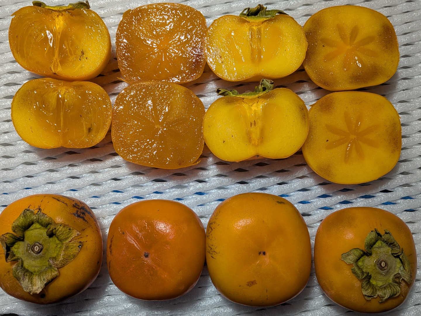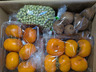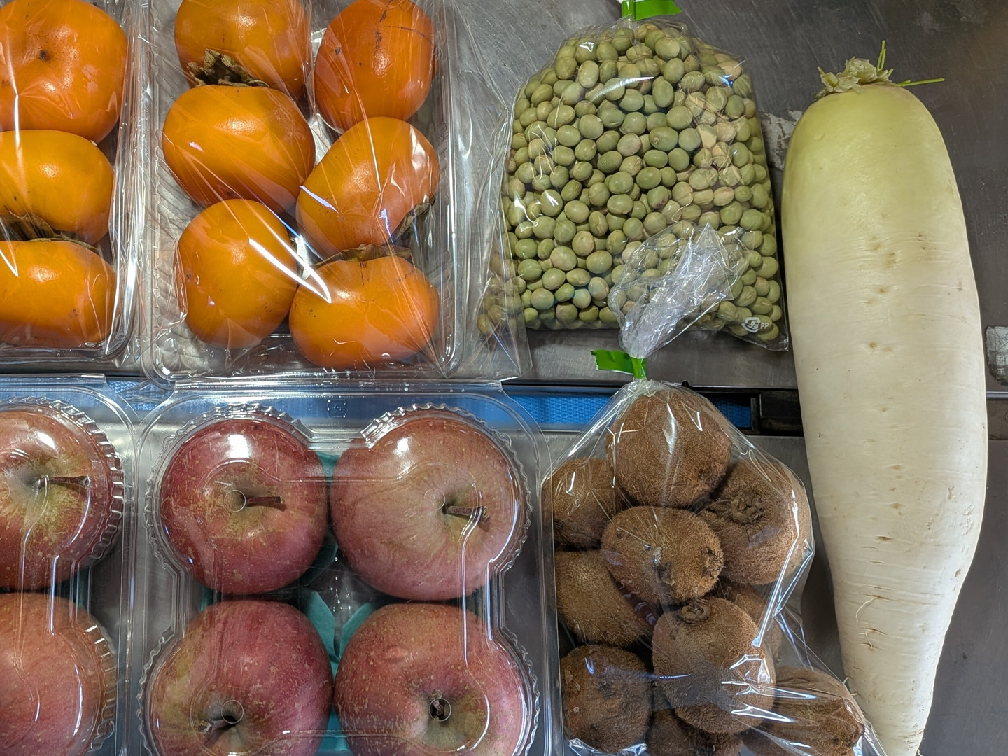 柿の品種は平核無しで柔らかくなったものとそうでないものがあり、大きさにより1パックの個数が異なります。低温で熟したものです。キウイはサイズが小さい規格外品です。リンゴは着色不良の小サイズです。青大豆とダイコンはB級品です。
