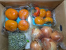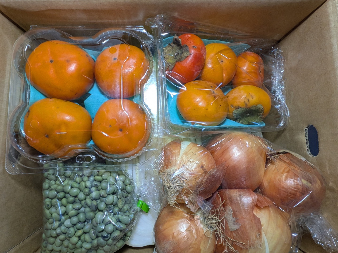ハクサイ1.2kg、タマネギ1kg、ネギ300g、青大豆300g、柿1.2kg、リンゴ1.7kg、ラ・フランス1.8kgの詰め合わせです。