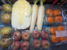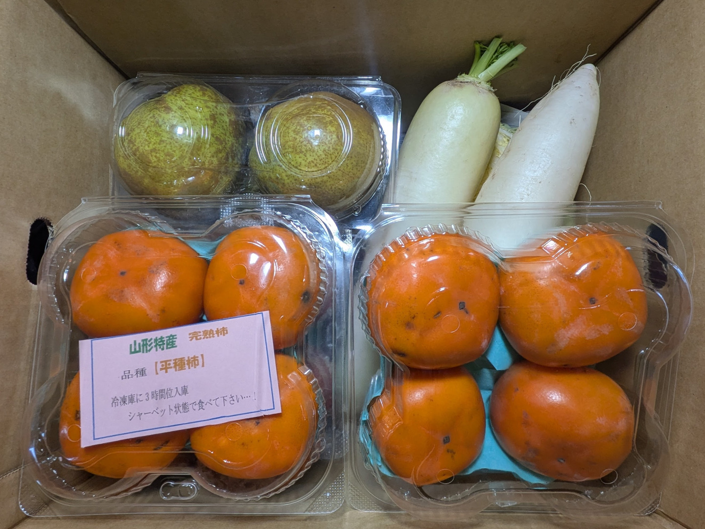 ハクサイ1.2kg、ダイコン1.5kg、柿1.4kg、リンゴ1.5kg、ラ・フランス1.5kgの詰め合わせです。