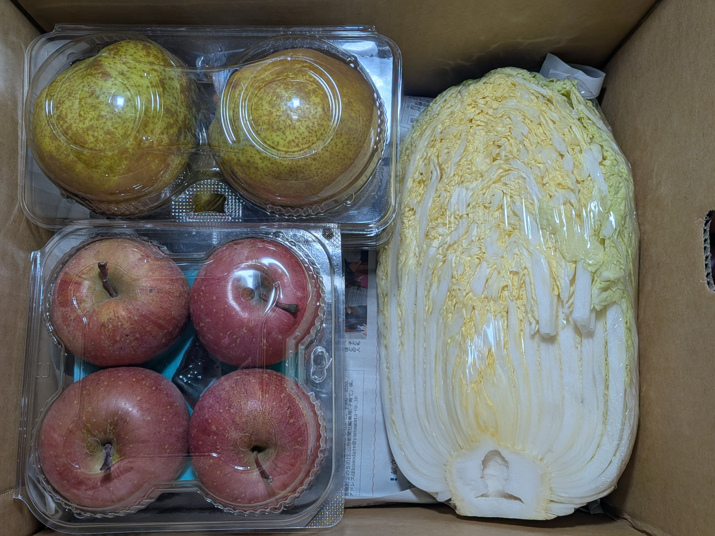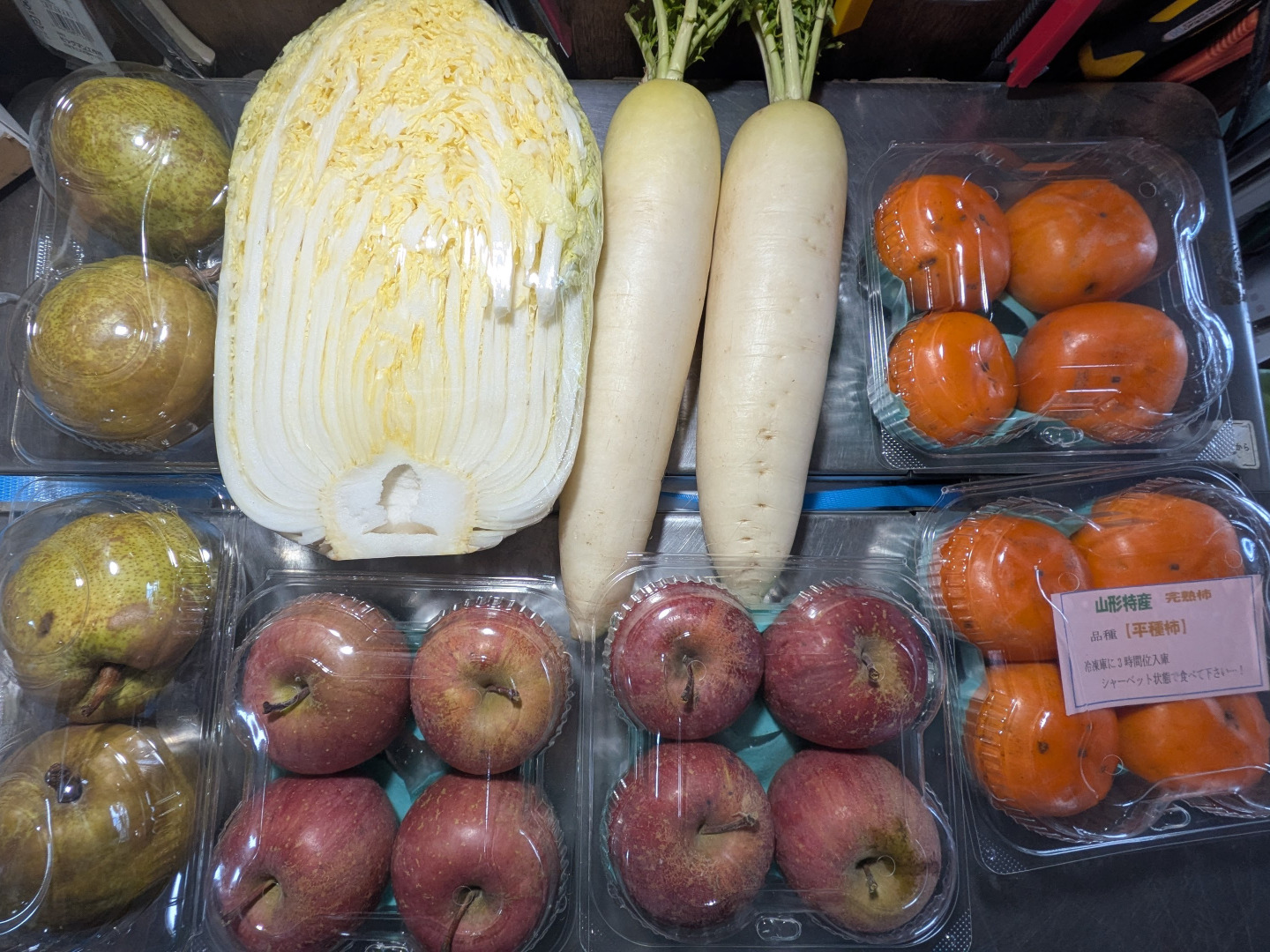 ハクサイは半分にカットしたものです。柿は平種無しで柔らかくなっております。リンゴとラ・フランスはキズ等があるB級品です。