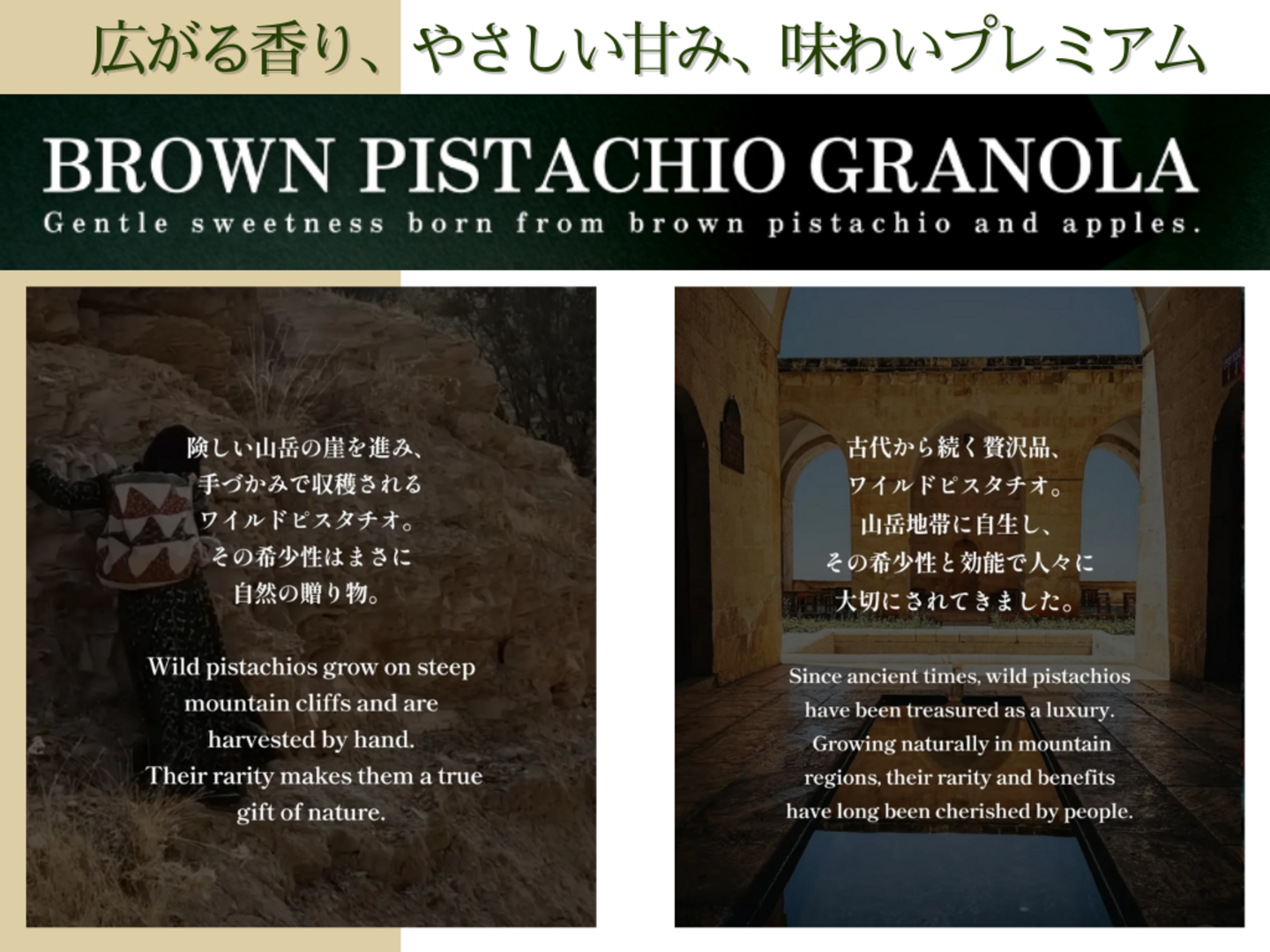 一般的なピスタチオとは異なり、茶色い見た目と、深みのある香ばしさとコクが特徴のトルコ南東部原産の希少な野生のピスタチオ(メネンギチ)を焙煎、黒糖とブレンドしたノンカフェインのシロップです。