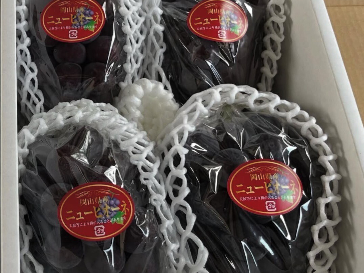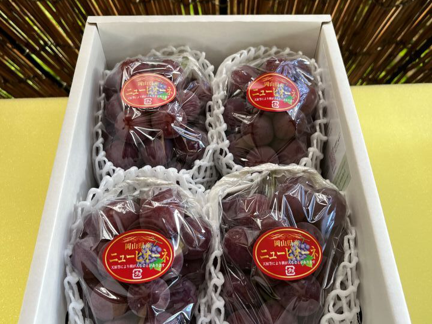 【晴れの国】岡山県産大粒で果汁たっぷり「ニューピオーネ」2kg以上(3~4房)です。爽やかな酸味とコクのある甘味、後味の良さが当園のニューピオーネの特徴です。