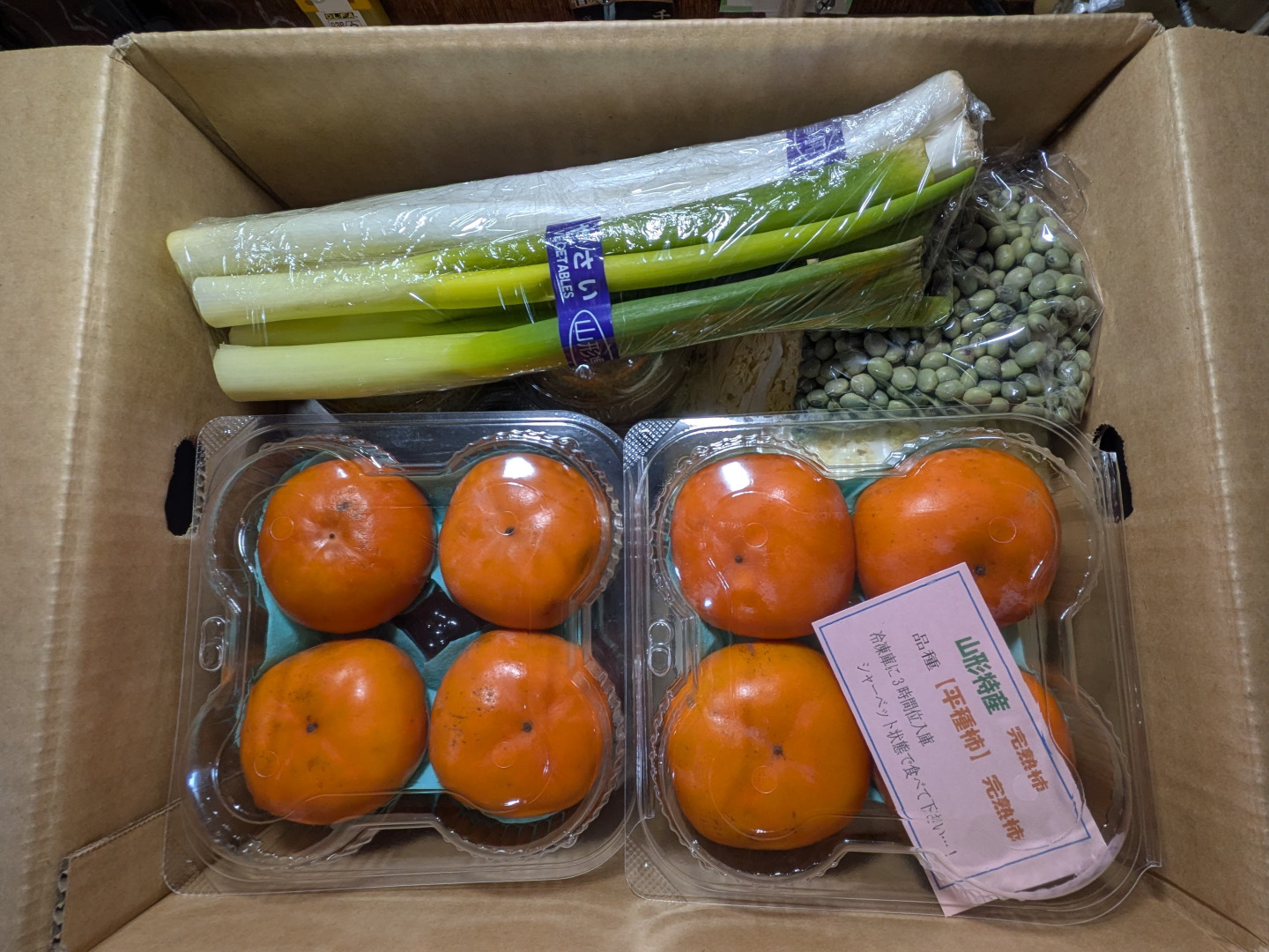 柿は完熟して柔らかくなっております。リンゴとラ・フランスはキズ等があります。野菜類はB級品で自宅前で直売しているものです。
