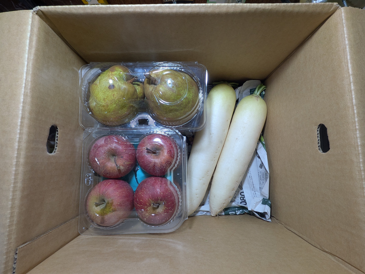柿1.3kg、リンゴ1.5kg、洋ナシ1.5kg、青大豆300g、ネギ300g、大根1.5kg、白菜1.2kgの詰め合わせです。