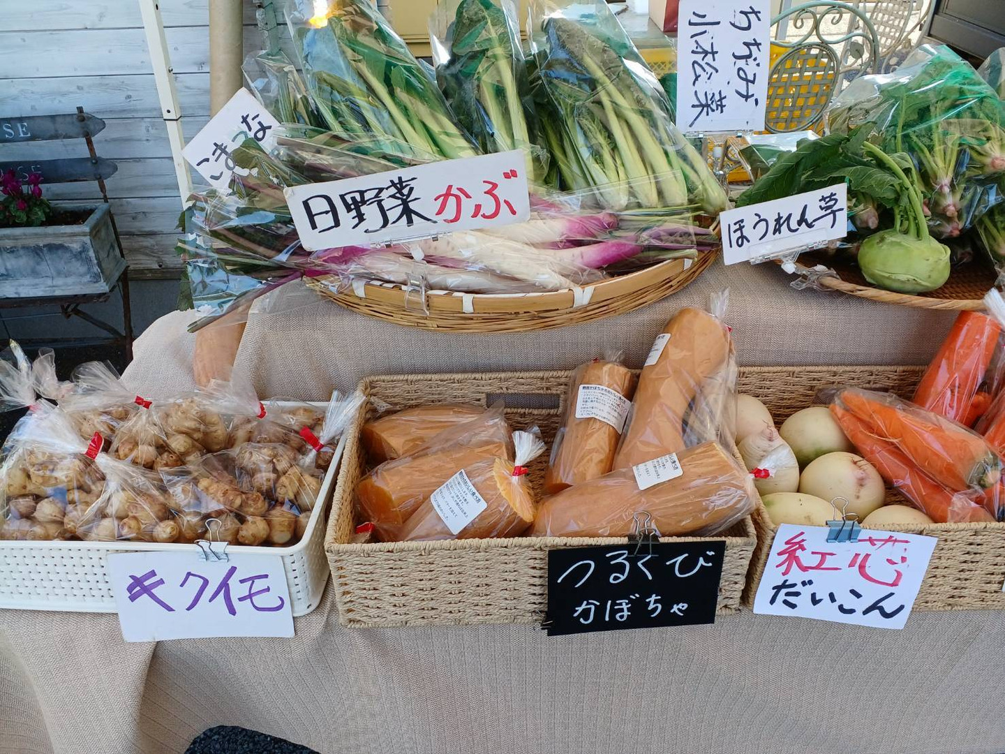 ・さつまいも(紅あずま、紅はるか、シルクスイート、パープルスイートロード、安納芋) ・ブロッコリー ・カリフローレ ・カリフラワー ・茎ブロッコリー ・キャベツ ・しょうが ・ケール ・レタス ・リーフレタス ・サニーレタス ・かぶ ・日野菜かぶ ・小松菜、ちぢみ小松菜 ・タアサイ ・ほうれん草 ・高菜 ・春菊 ・かつお菜 ・水菜などです。