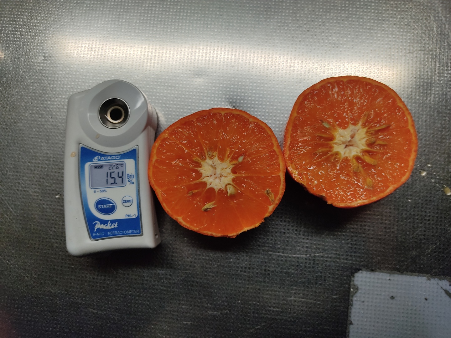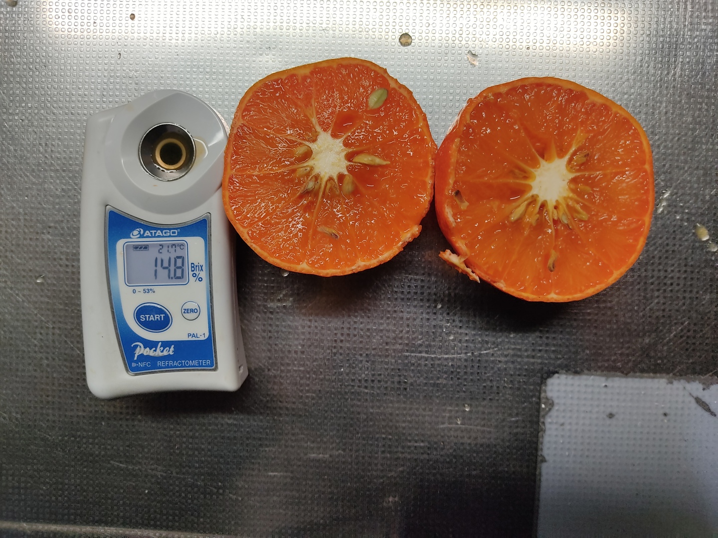 ・果肉は濃橙色で、じょうのう膜は比較的薄く食べやすく、果汁の糖度は平均13%で高い。含核数は平均5粒程度です。あと、アンコールのような芳香が感じられます。