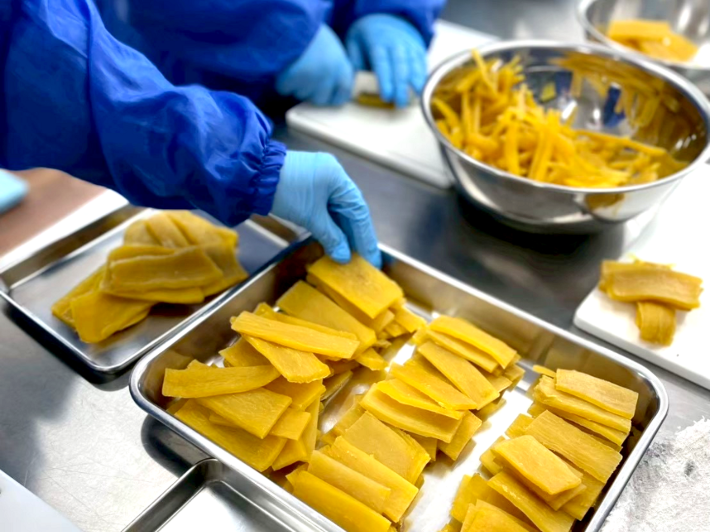 京都府の自社工場にて、芋の選別から蒸し上げ、皮むき、そして干しまで、すべての工程をひとつひとつ手作業で丁寧に行っています。